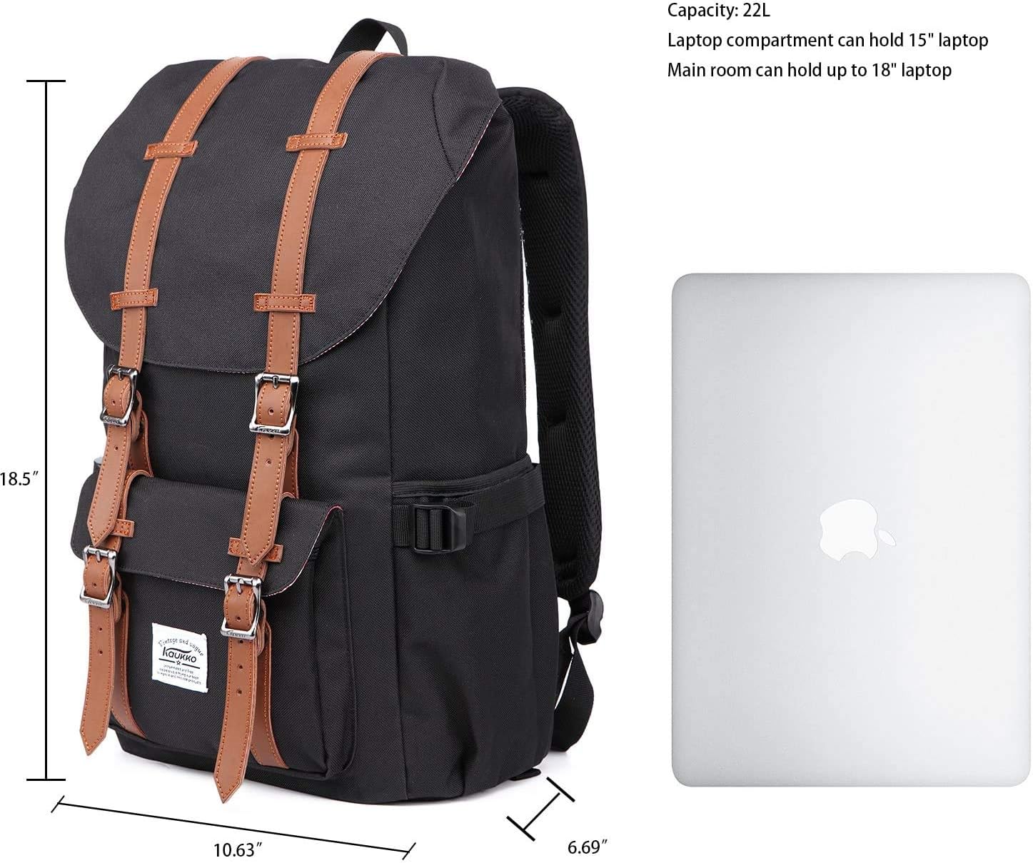 - LARGE CAPACITY & STUFF ARRANGED TIDILY when using this knapsack. This travel laptop backpack 's approximate dimension is 10.63*6.69*18.5(L*W*H), Capacity: 22L. Laptop compartment fits up to 15.6" Laptop, while the outer compartment can hold 18". 1 main compartment+ 1*outside zipper pockets+ 2*inside pockets+ 2 side pockets. Tablet, Macbook Air/Pro,Ipad, phone,pen,notebook,wallet,umbrella,books,folders,or other things can be put in the bag.