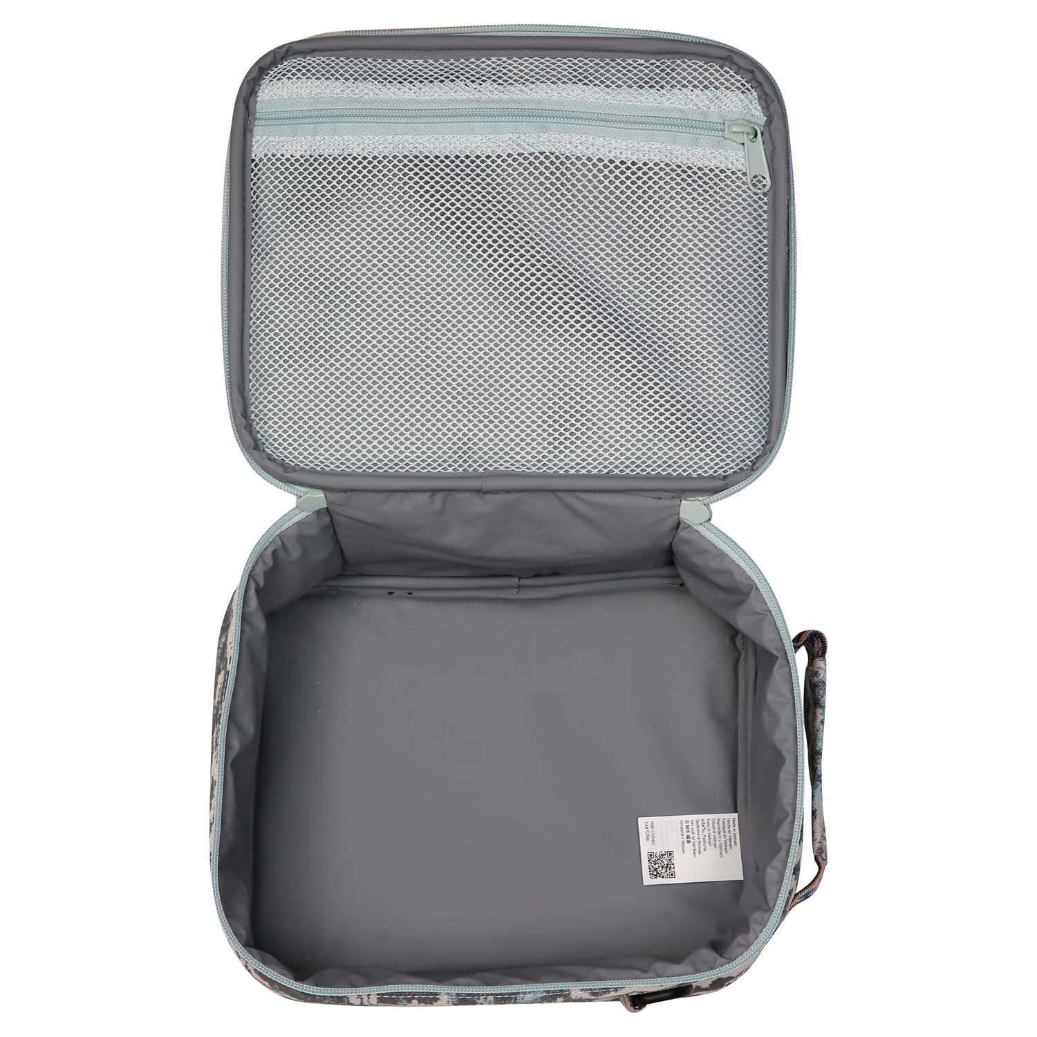 Details: Fully insulated/padded cooler bag, cross body adjustable and detachable shoulder strap, plastic d-ring and spring hook hardware, fixed pattern webbing hand strap with pinched handle, main compartment with two-way zip closure, rope loop zip pulls, exterior Velcro slip and zip pockets, interior mesh zip pocket. Designed to hold ice packs, not loose ice.