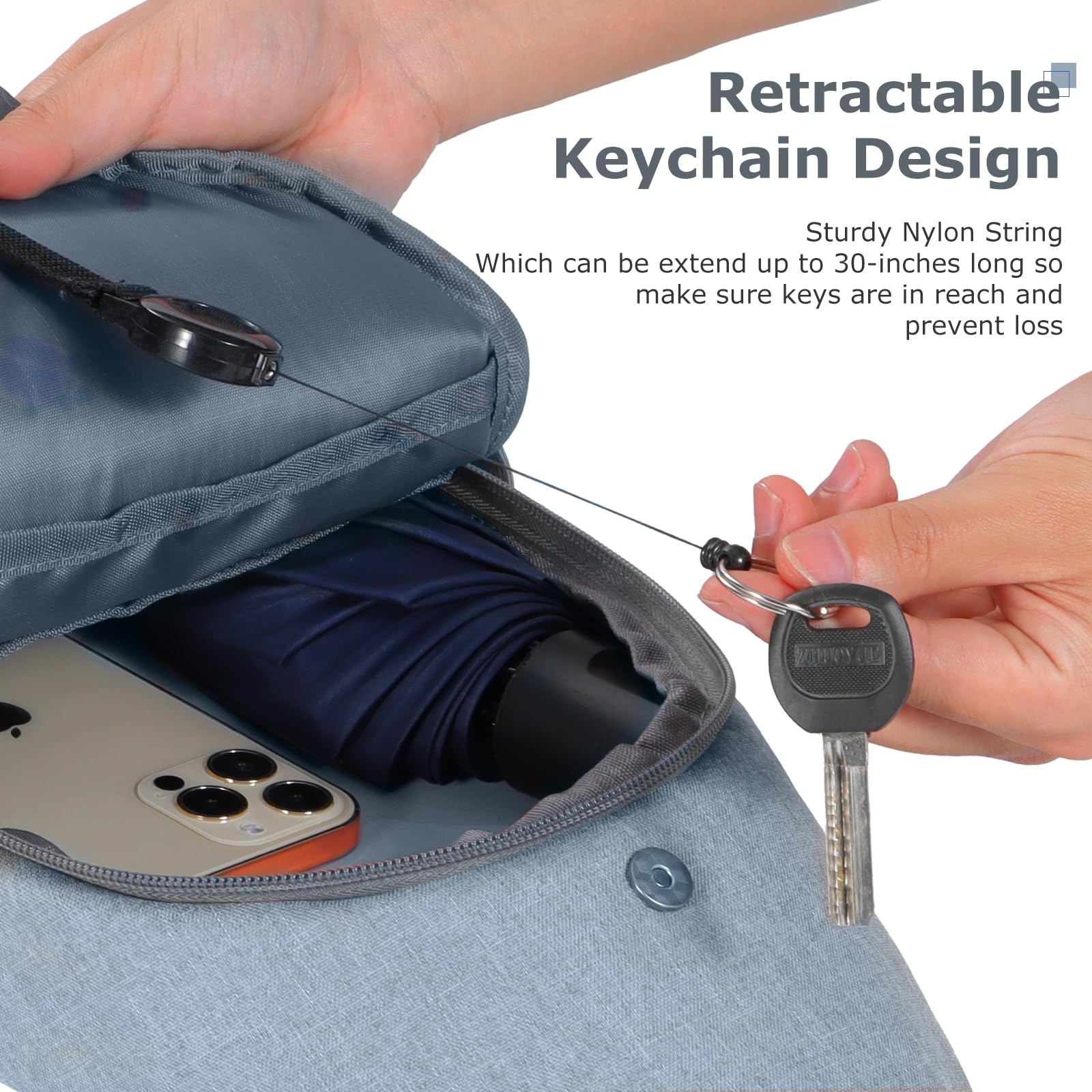 - 【Hands Free】This Keanoo crossbody bag has a main zippered pocket which fits Ipad screen under 10.2 in, and a phone pocket on the strap which fits a phone screen size under 7.5 in. This sling bag also has 2 mesh side pockets, can fit your umbrella or water bottle, and a retrievable key ring with elastic rope inside pocket, can hang your keys safely. All in all, this small shoulder bag is enough for your essentials, thus you can be totally hands free with this sling backpack on you.