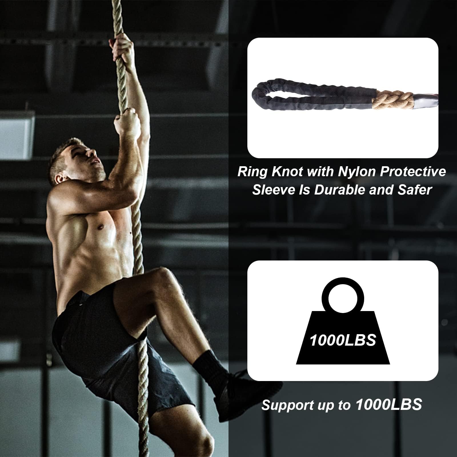 - NON-SLIP HEMP ROPE: GYM CLIMBING ROPE is made from hemp rope, a climbing rope that feels good in your hand, is easy to grip, and can hold up to 500 pounds when properly installed. The climbing rope forces you to utilize your entire body - arms, legs and core - as you climb to the top. Build lean muscle while working your arms, back, chest, legs, abs and core.