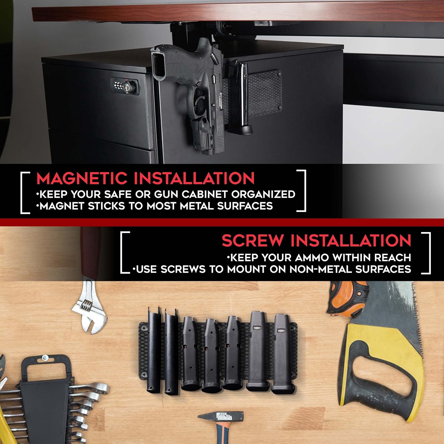 - UNIQUE PATENTED DESIGN: Mount screwless against any metal surface thanks to 3 strong magnets on the backside. Or use the flushed screw holes for any other surface. Efficiently store almost any type & brand of metal magazines and clips on the same rack.