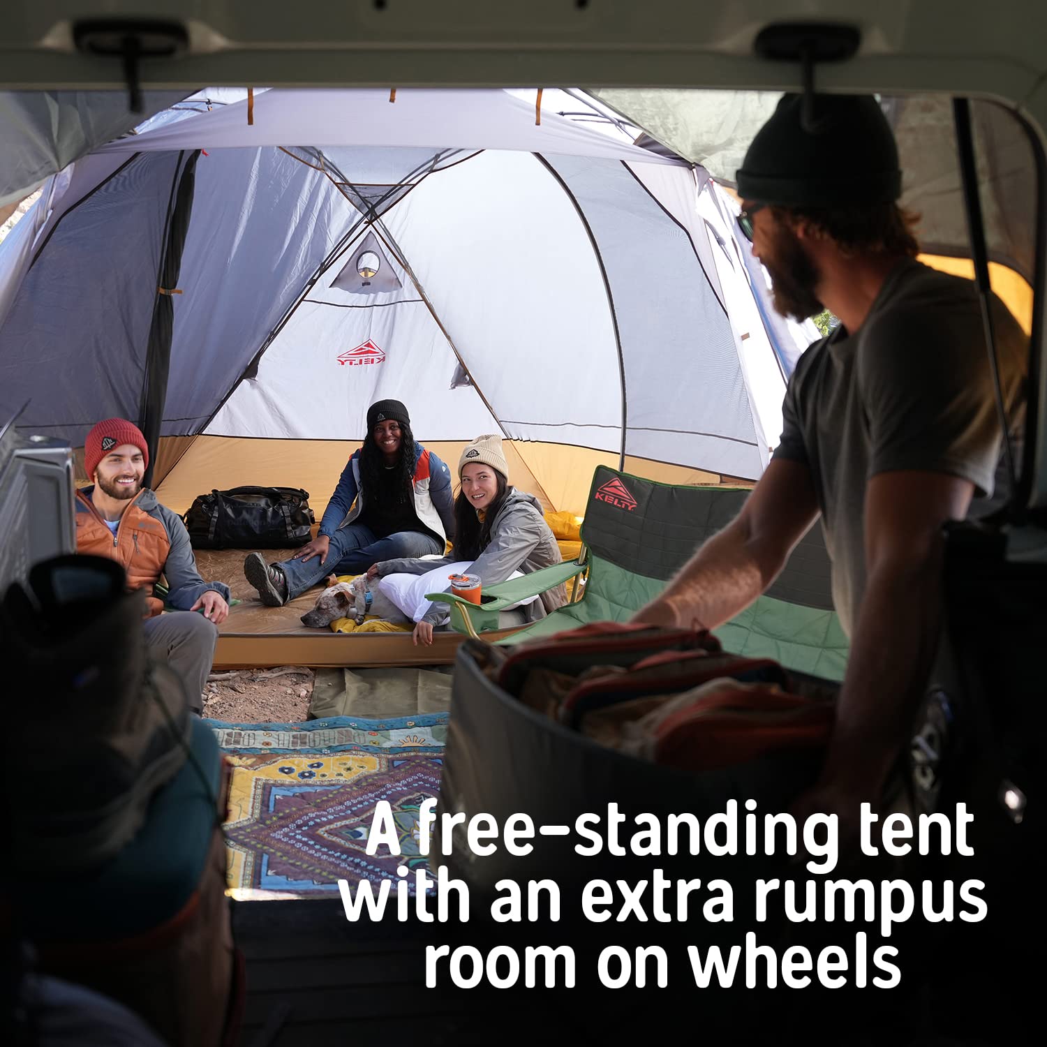 Details: Kelty Caboose 4P Tent and Vehicle Awning Shelter, Universal Attachment for Vans, Trucks, SUVs, Standing Height Door, Massive Vestibule, Fully Freestanding, Designed in Sunny Colorado (2023)