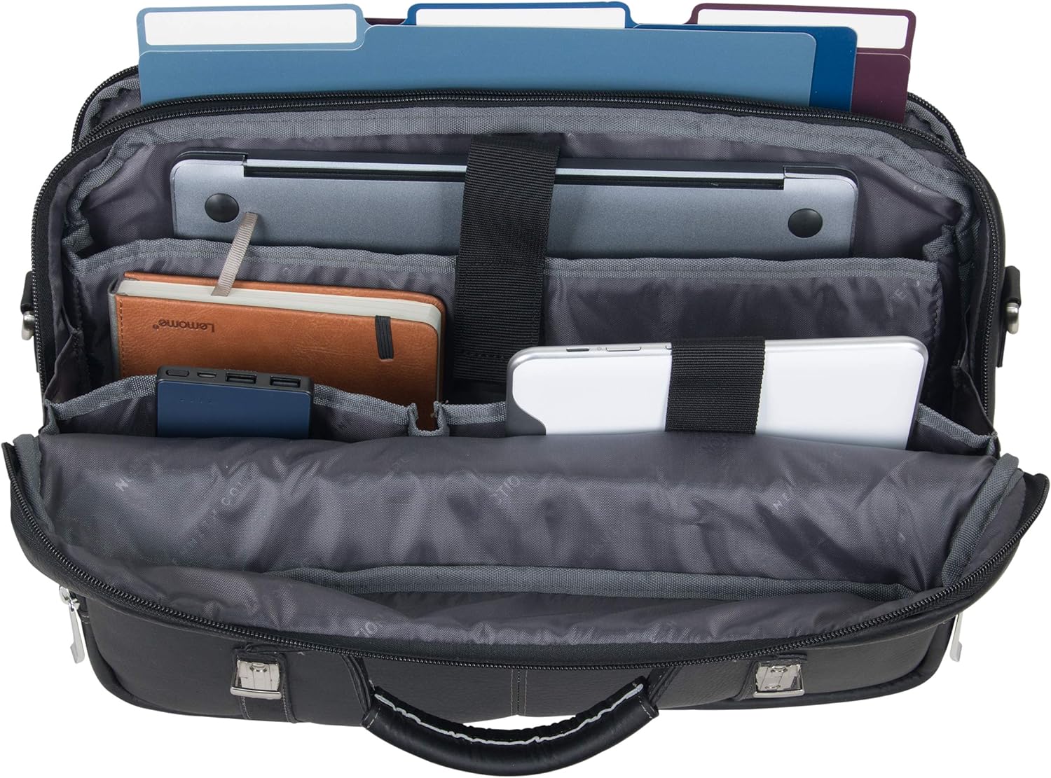 - ★ ORGANIZED COMPARTMENTS: (i) Front pocket organizer holds a variety of business essentials including a cellular phone. (ii) Front compartment features a padded computer pocket, tablet pocket, and an open top accessory pocket. (iii) Rear exterior open compartment allows for easy access to frequently needed items.