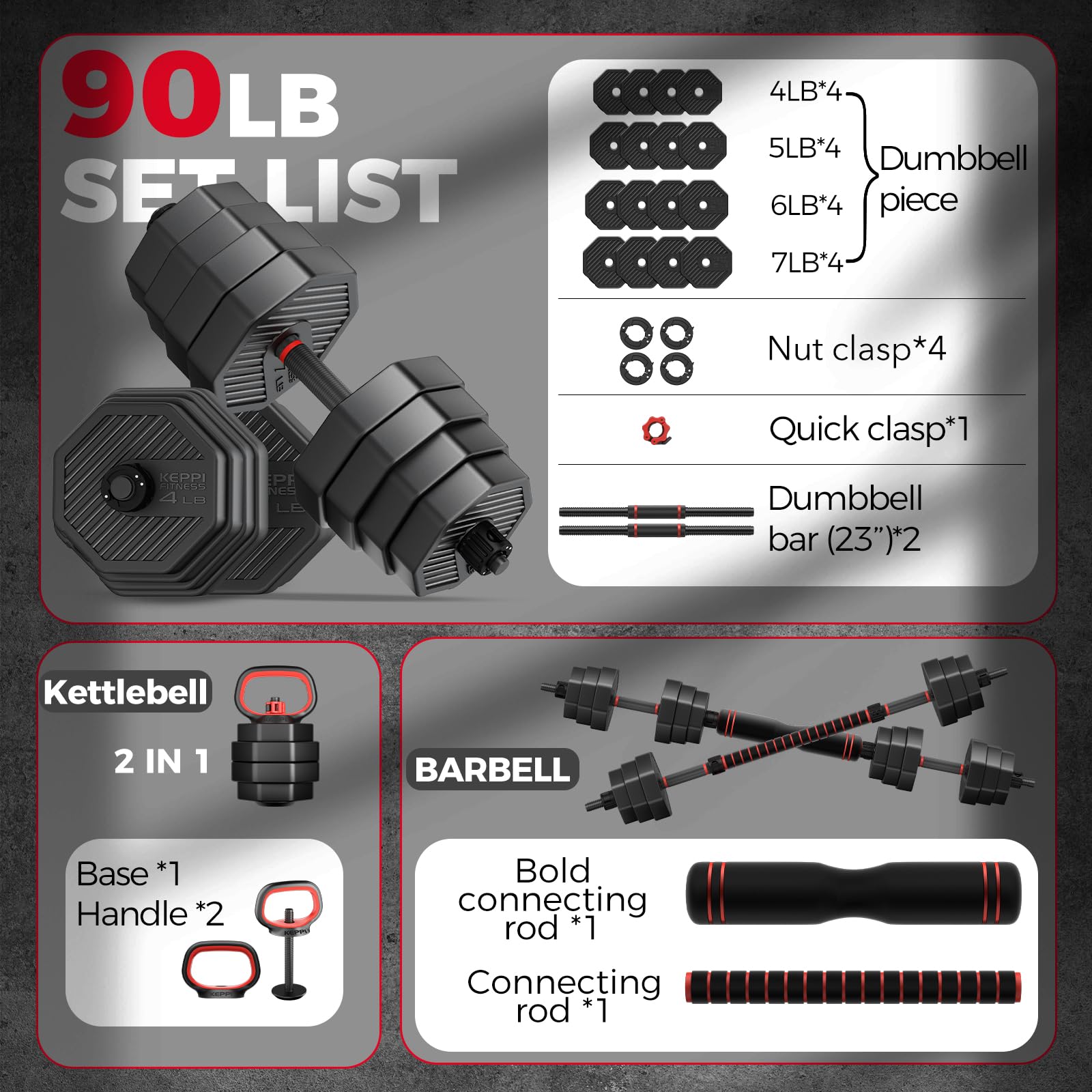 KeppiFitness Adjustable Dumbbell Set, 30/40/50/70/90 lb Weight Set with Connector Bar, 4 in 1 Workout Gear with Dumbbell, Kettlebell, Barbell, Push up Handle for Home Gym Fitness Exercise…