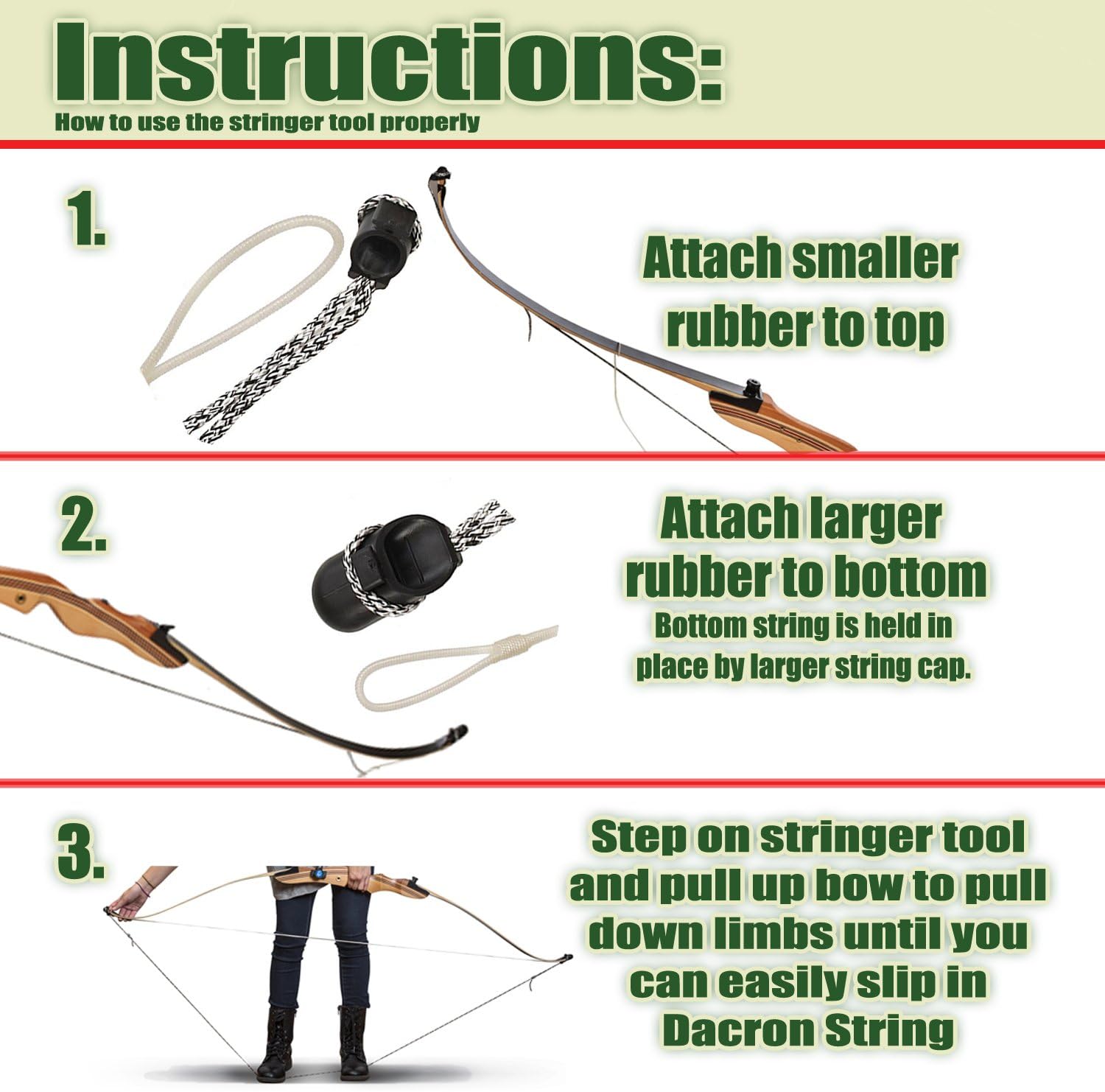 - 【Simple-Easy-Quick】 The Keshes stringer tool simplifies stringing recurve, long, or traditional bows with Dacron string. This stringing tool is designed to safely and quickly string and unstring all recurve, conventional, and long bows, providing quick and painless assembly each time, making it ideal for hunting bows and archery targets.