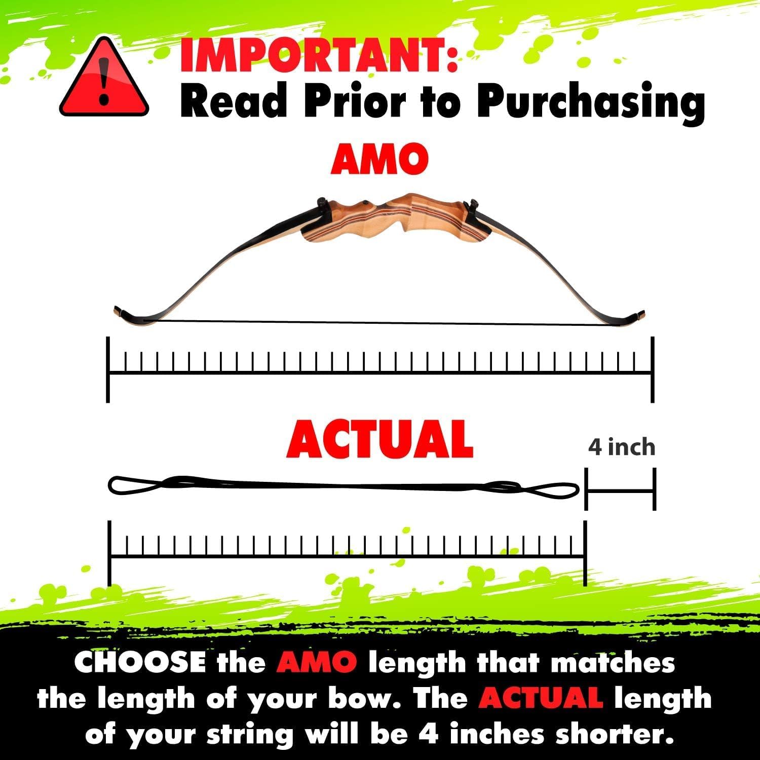 - 【Size Lenth & Strands】 Your recurve bow's length, or AMO length, indicates the appropriate AMO size. Compared to the AMO length, the actual string length is 4 inches shorter. Smoother launch is achieved with fewer strands, while more power requires more strands. Recommendation: Up to 40 lbs: 12 strands, Up to 50 lbs: 14 strands, Up to 66 lbs: 16 strands