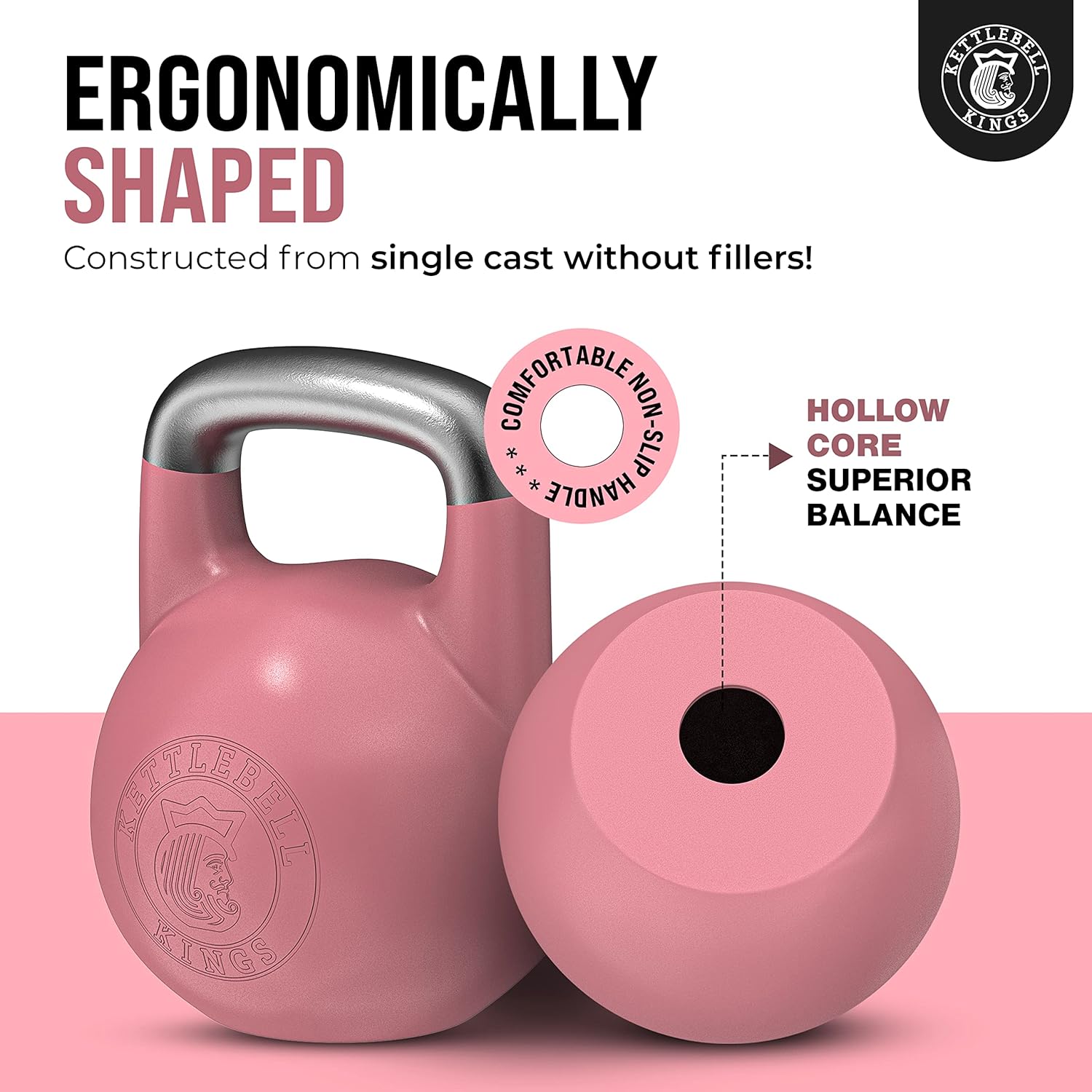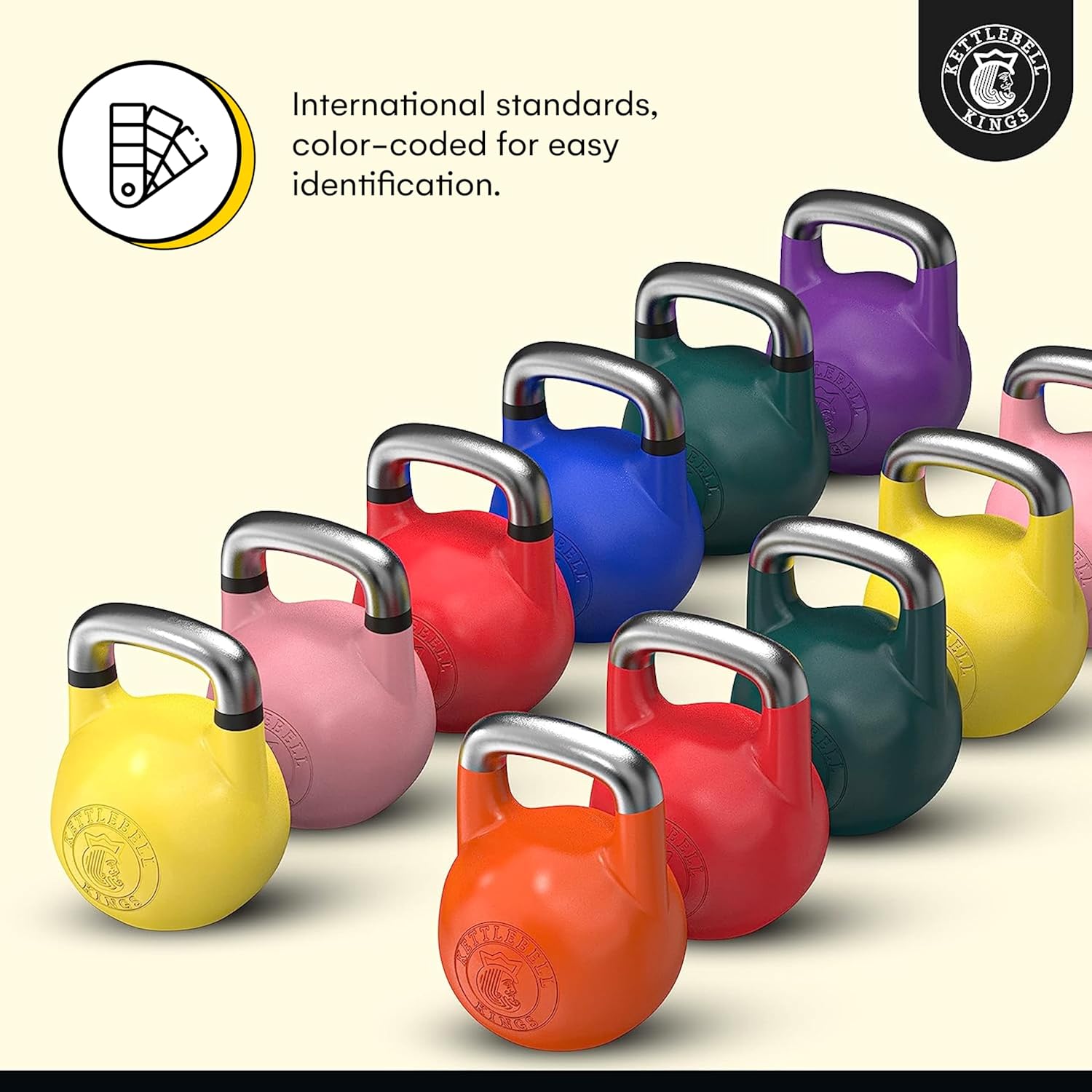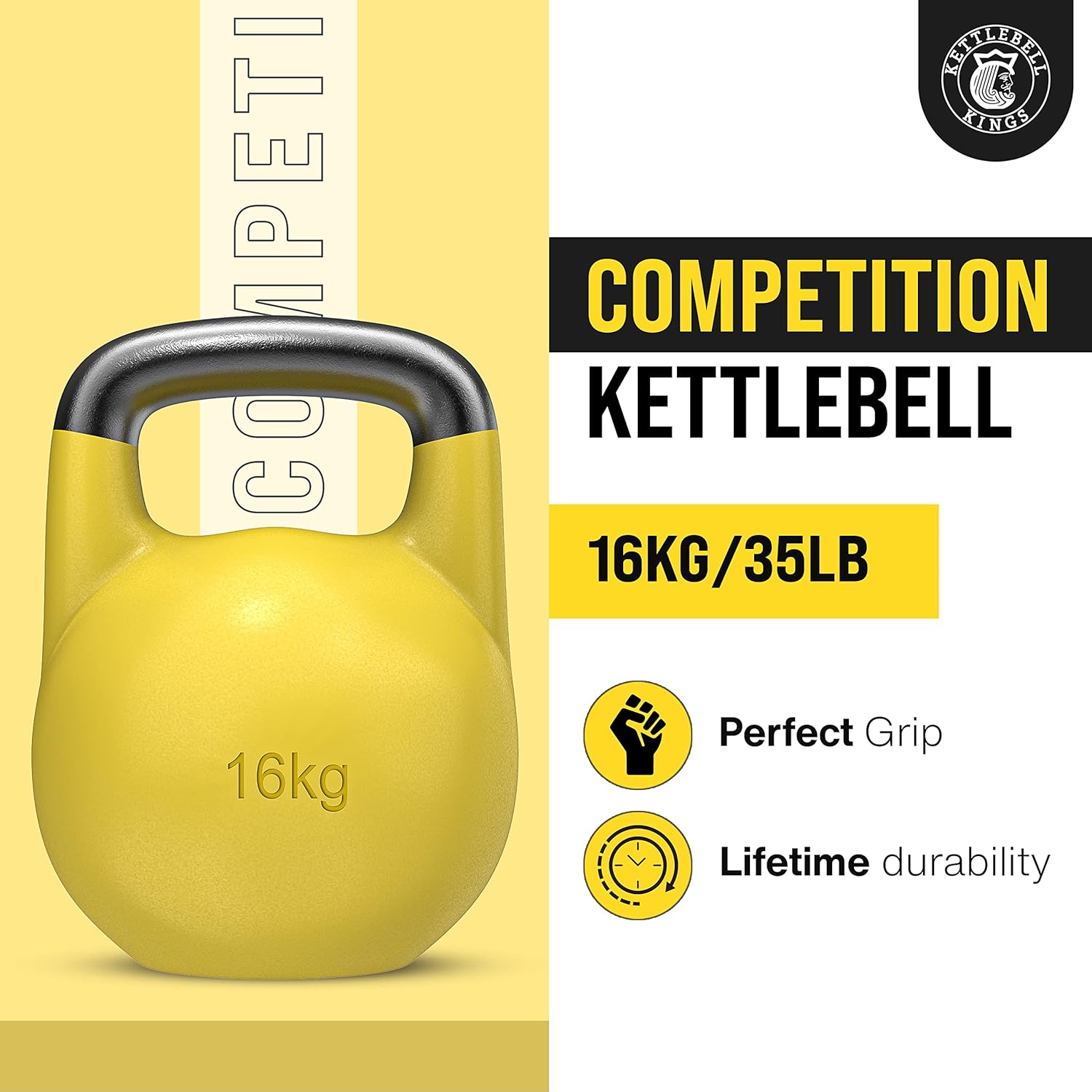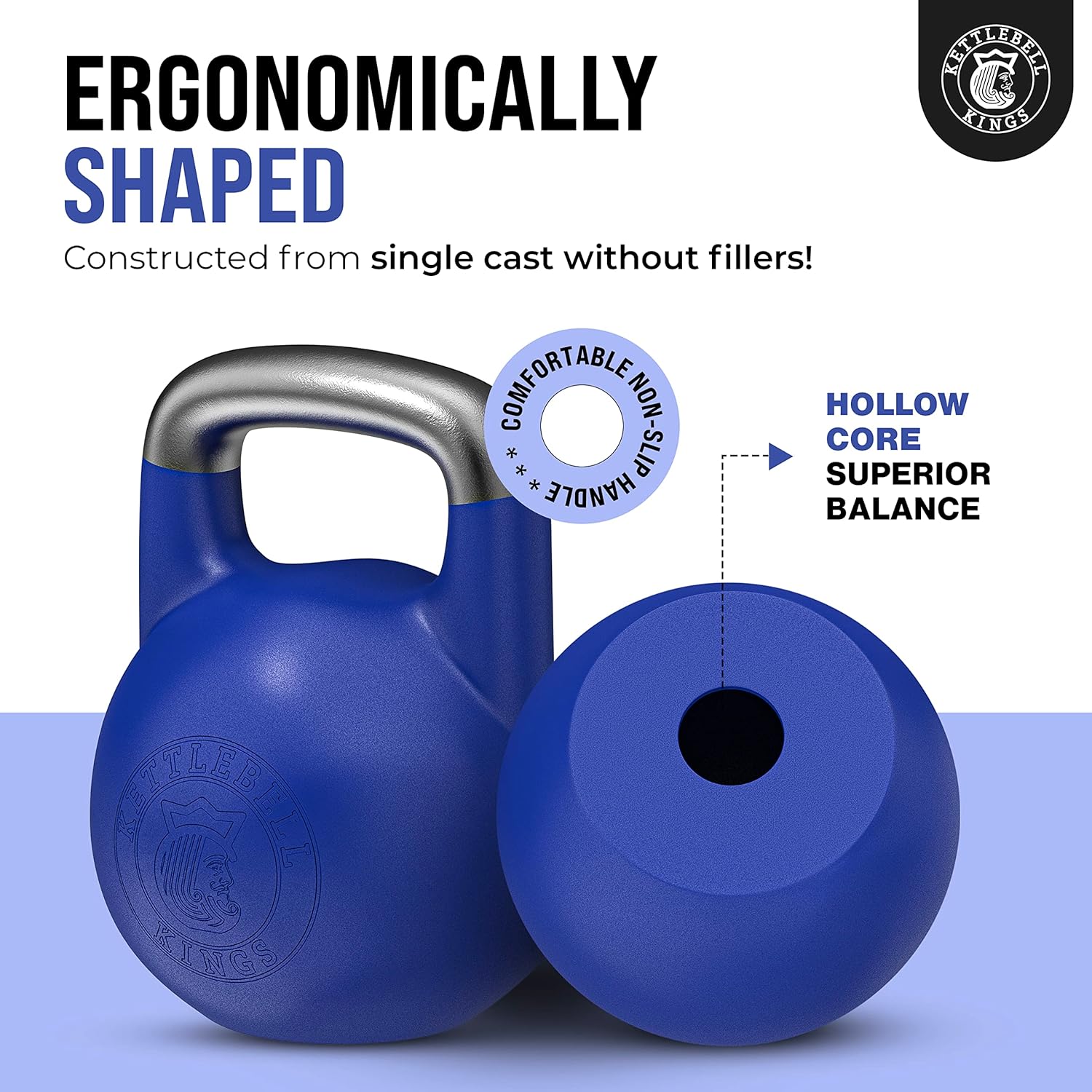 - PREMIUM DESIGN: Elevate your workouts with the Kettlebell Kings competition kettlebell. Its smaller size and ergonomic curvature provide effortless handling and comfort during lifts.