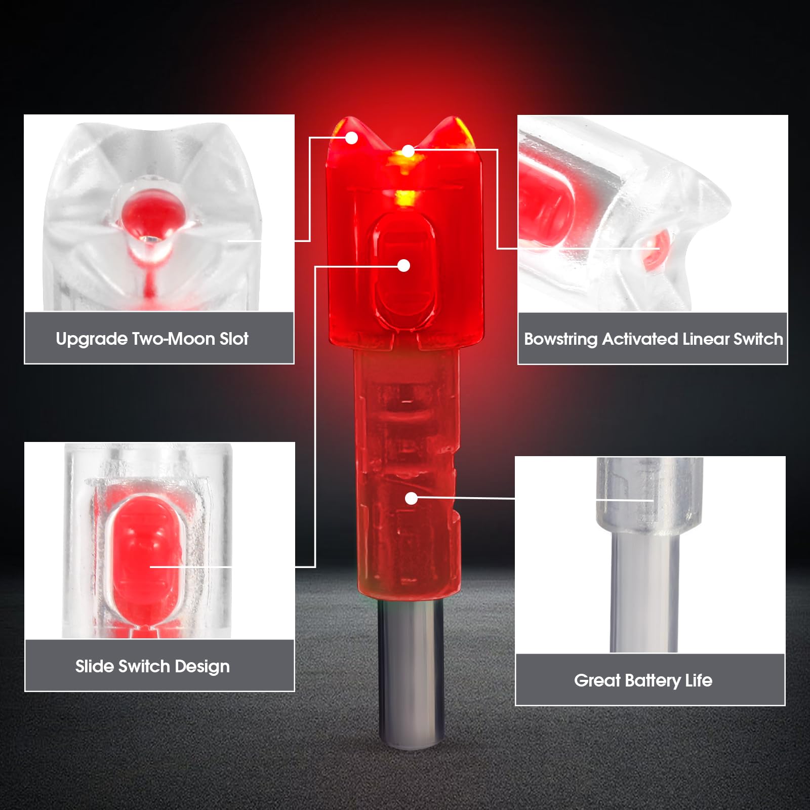 - 【Upgrade Design】:Our crossbow lighted nocks are Two-Moon slot design that can rotate 90 degree instead of 180 degree, allowing you to adjust the position of the arrow more easily, and enhancing the experience on archery