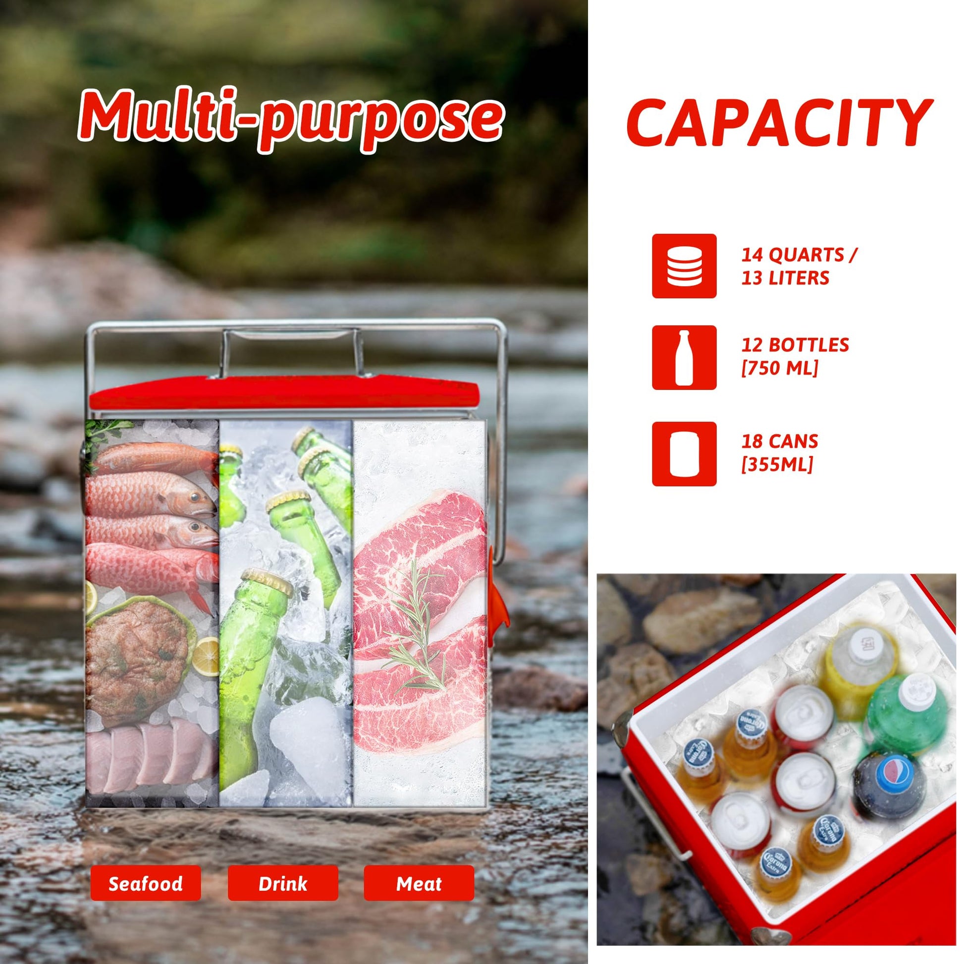 Kickleen Retro Ice Chest Cooler with Bottle Opener 13L (14Qt), Stainless Steel Vintage Style Ice Bucket for Camping, Party, Beach, Picnic, RV, BBQ, Tailgating, Fishing (Red)