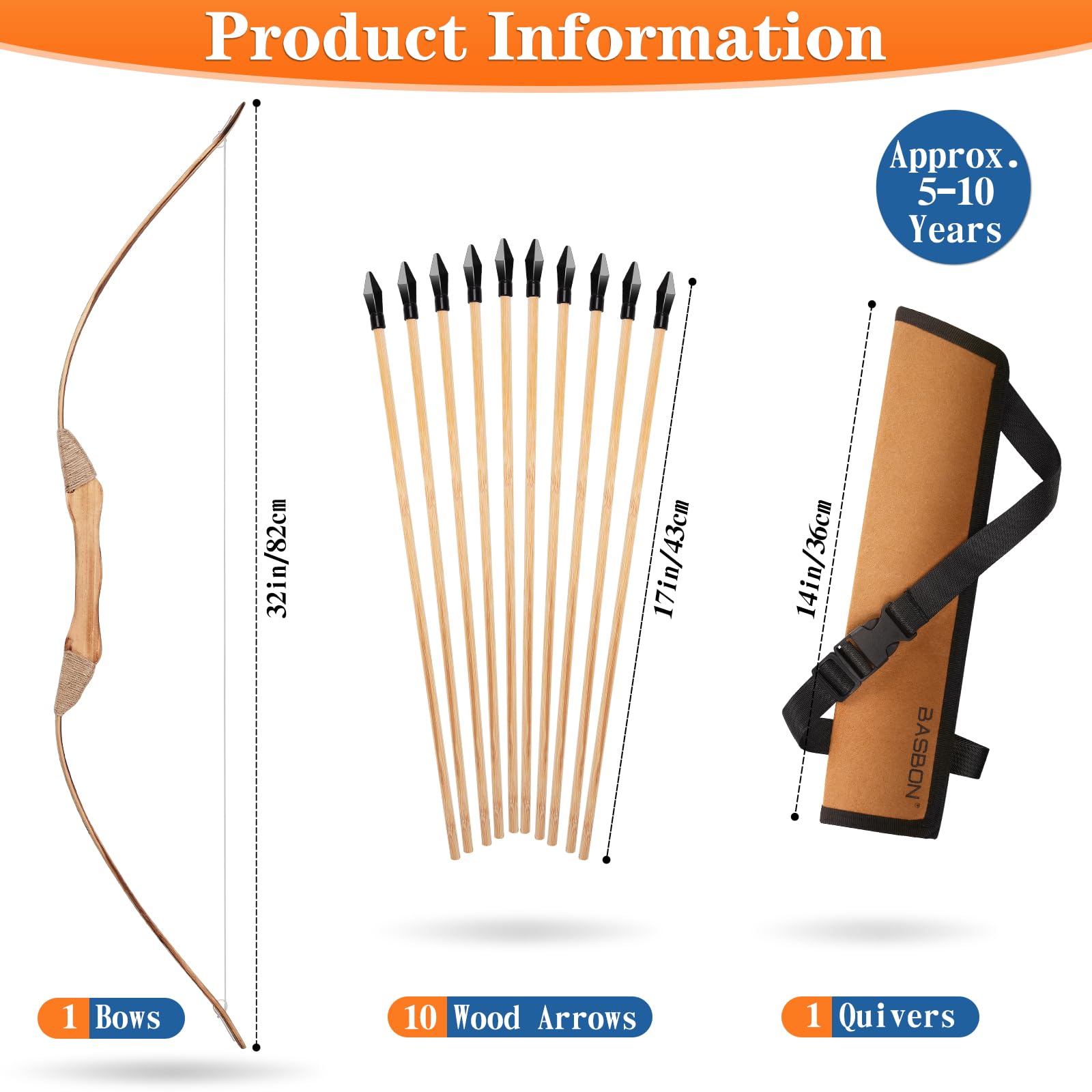 - Handmade wooden bow and arrow set includes 1 rustic handmade bows, 1 brown quivers, 3 targets, 1 storage bag and 10 sturdy wooden arrows with soft rubber tips. It’s a great introductory set for kids who are interested in archery.