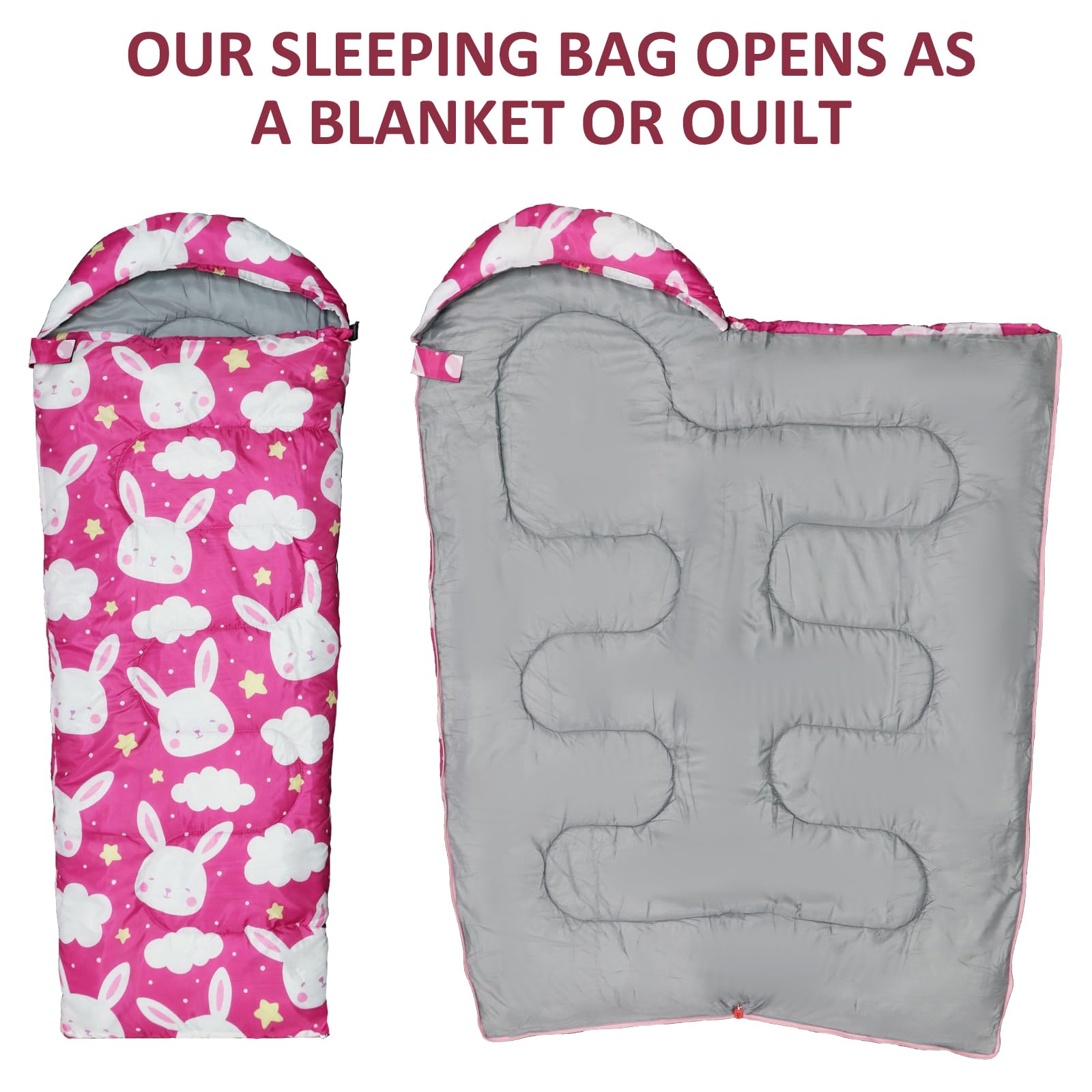 - Kids sleeping bag is designed with backpack style sack. Each sleeping bag comes with a compression sack with straps, allow you convenient carry and storage. Our sleeping bags have 2-way zipper which can fully open as a blanket and let your feet come out