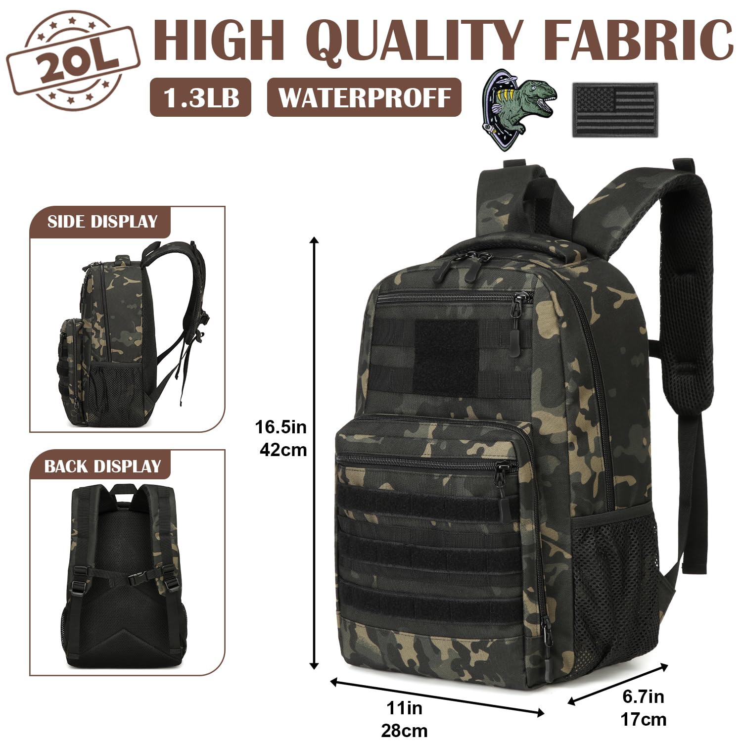 - Robust & Durable: The Backpack is made of high quality nylon, reinforced and double stitched at all stress points, special coating makes the Tactical Backpack water resistant and scratch proof, strong and durable. Items will be not wet in light rain.high quality material guarantees longer lifespan in camping and outdoor activity (Includes 2 Patches +1 Carabiner)
