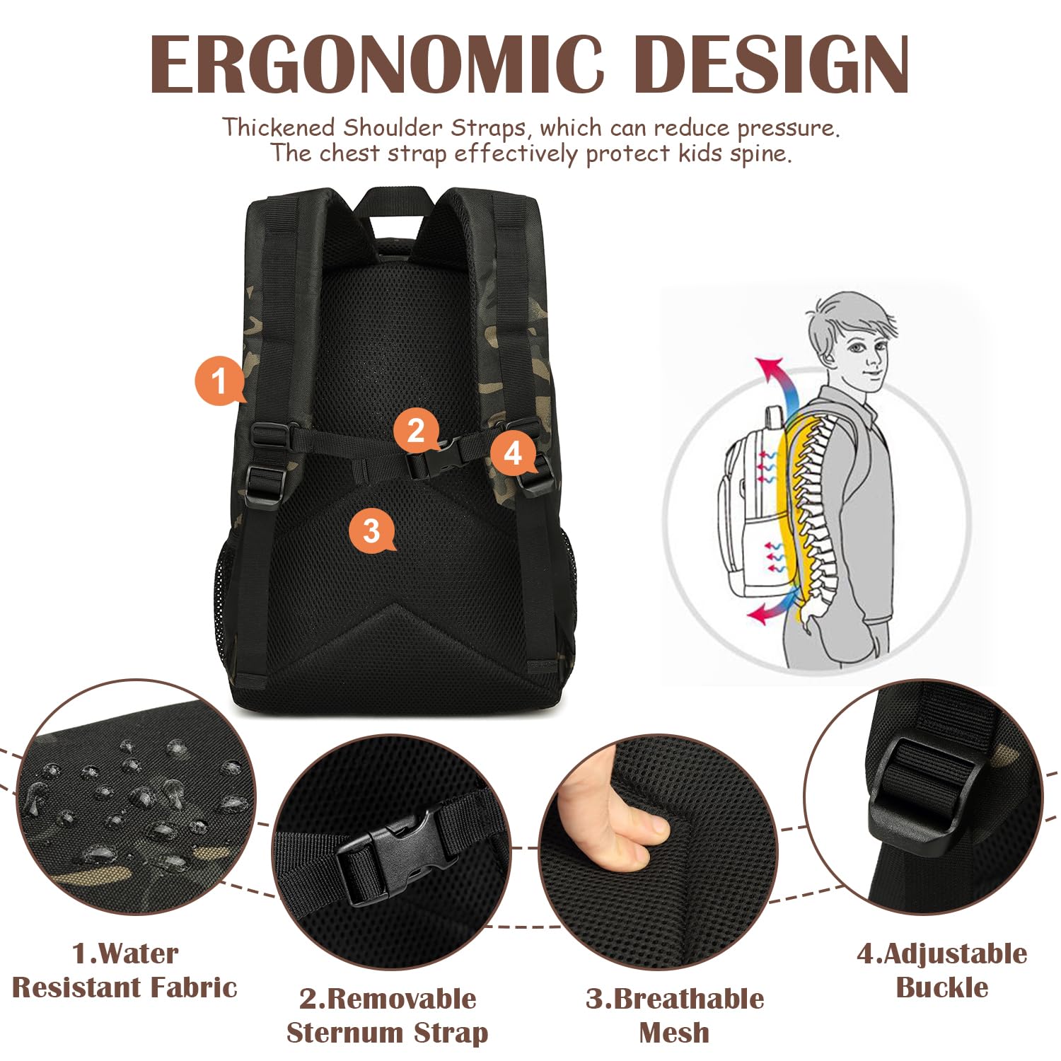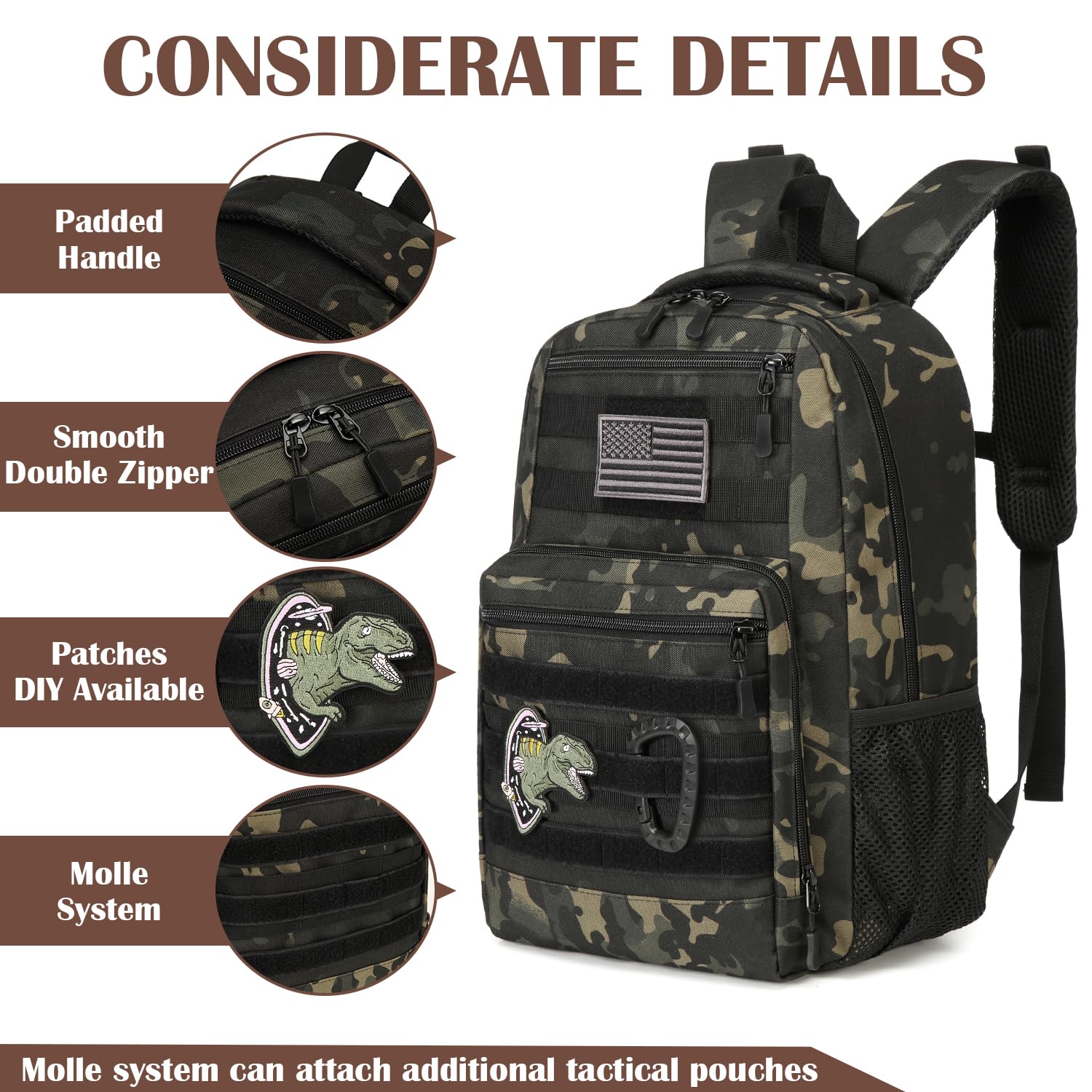 - Molle System: This boy's backpack features Molle webbing on the front for adding extra tactical pockets, hiking hooks or gear. This can be used as a MOLLE backpack, a military backpack for kids. Great for hiking, school, travel, camping, climbing and other outdoor activities