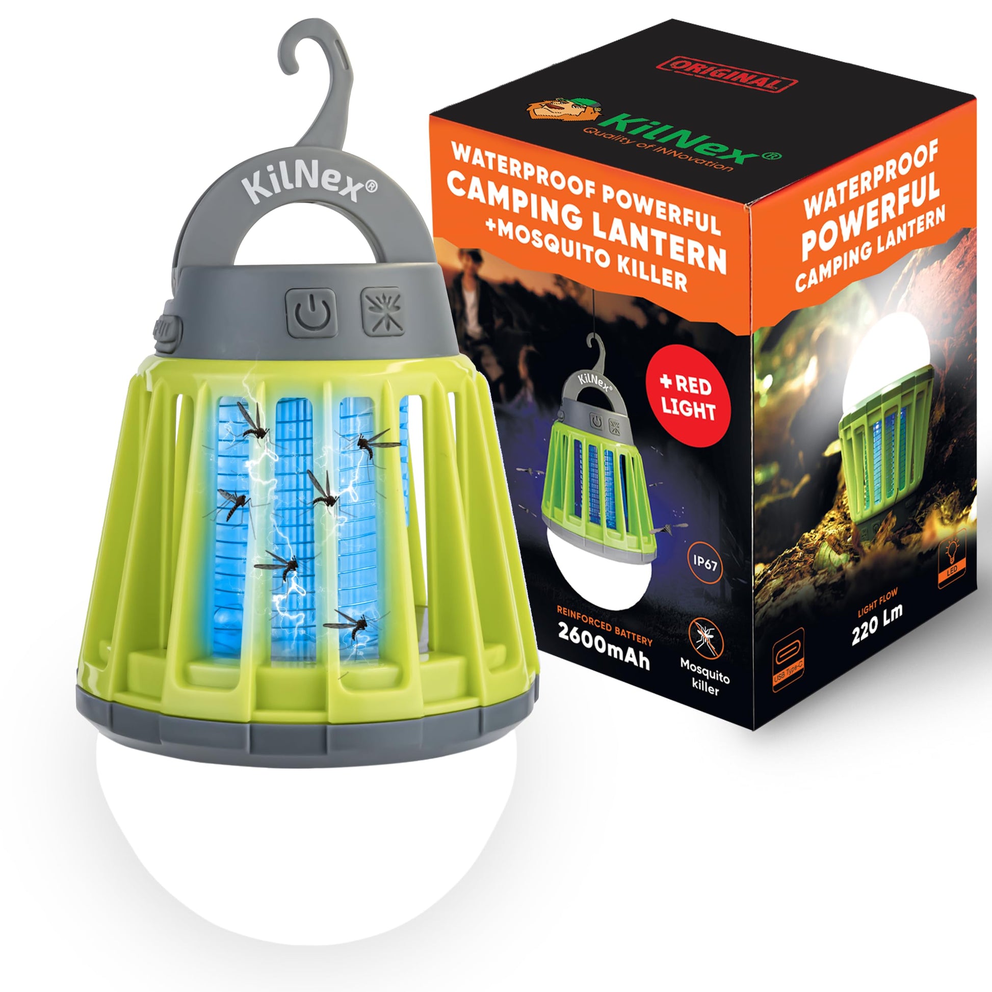 KILNEX Camping Lantern with Mosquito Protection | Rechargeable Battery, USB Type-C Charging | Waterproof IP67 | White and Red Light | Compact Portable for Camping, Hiking, Fishing