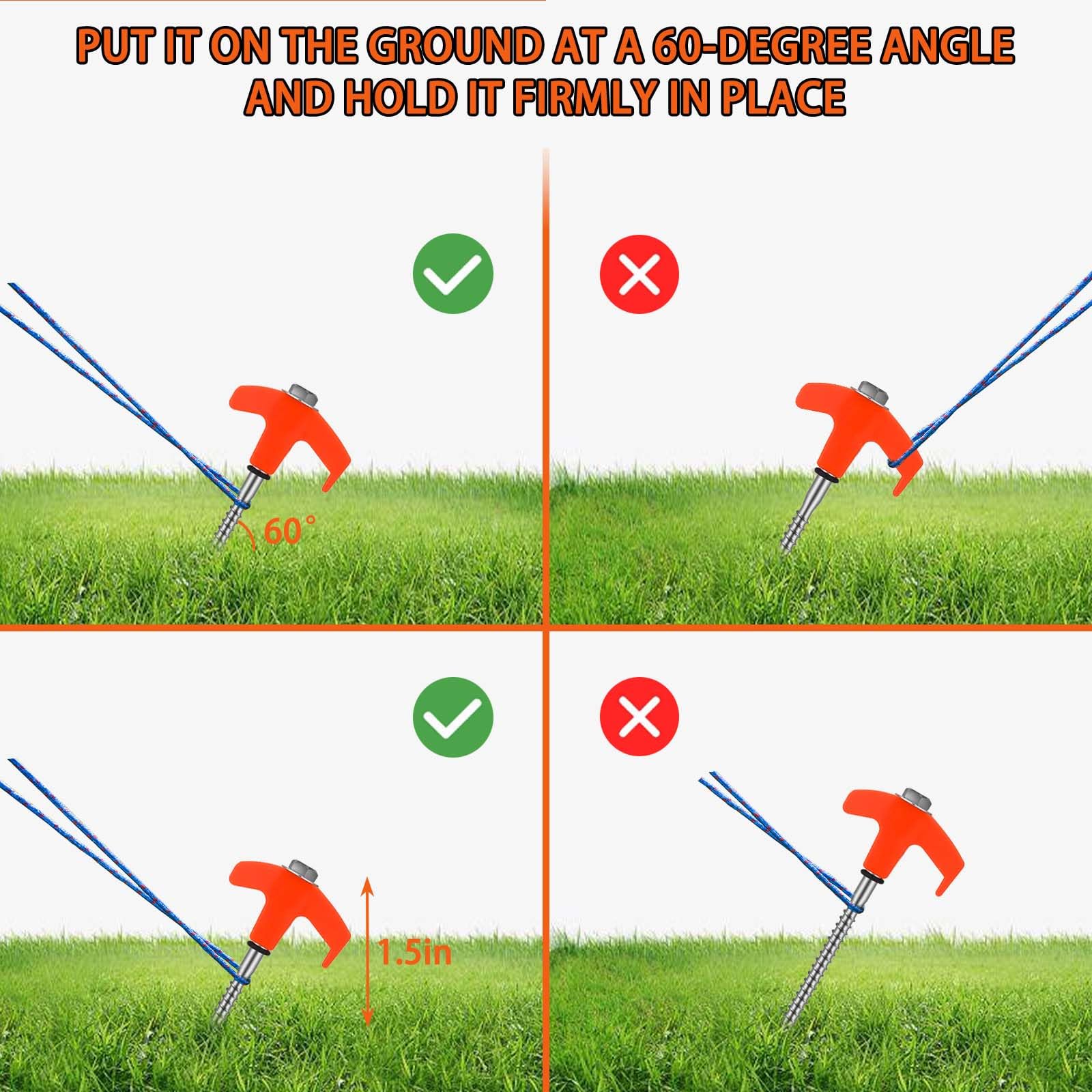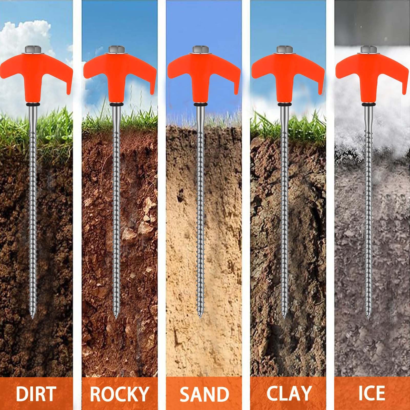 - 【Strong and Secure】: The ground anchors screw in are steel threaded for enhanced grip, ensuring a secure fixing in a variety of terrains, even in harsh weather conditions can provide maximum stability and ensure safe use. The bright stopper prevents tripping hazards, and makes it easy to find your tent stakes