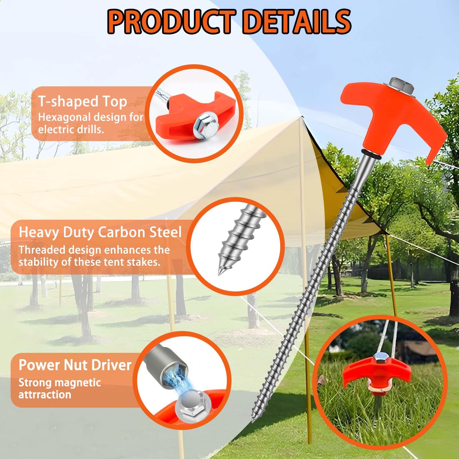 - 【Easy to Use】: Installing these camping stakes is extremely simple. Just use an electric drill or manually screw them into the ground to quickly secure your tent, when the tent needs to be moved and dismantled, using the special nail puller included with the package. greatly reducing the time and effort required for setting up camp and making your outdoor experience more enjoyable