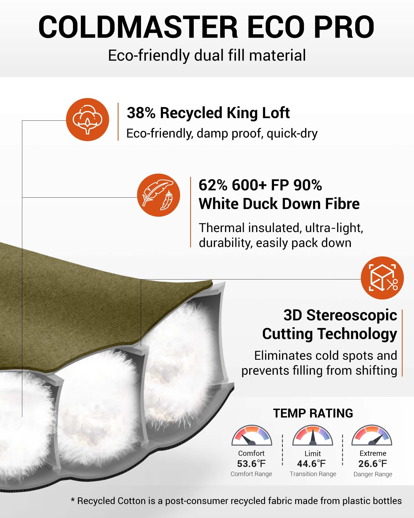 - ECO-FRIENDLY COLDMASTER SLEEPING BAG-Sustainable Warmth for Nature Lovers: Experience the perfect blend of comfort and eco-responsibility with our Coldmaster sleeping bag. Filled with a premium mix of 62% high-quality 90% white duck down and 38% eco-friendly cotton, this sleeping bag offers superior warmth while using sustainable materials. Embrace comfort without compromising the planet with Coldmaster renewable technology that ensures your adventures leave a smaller environmental footprint.