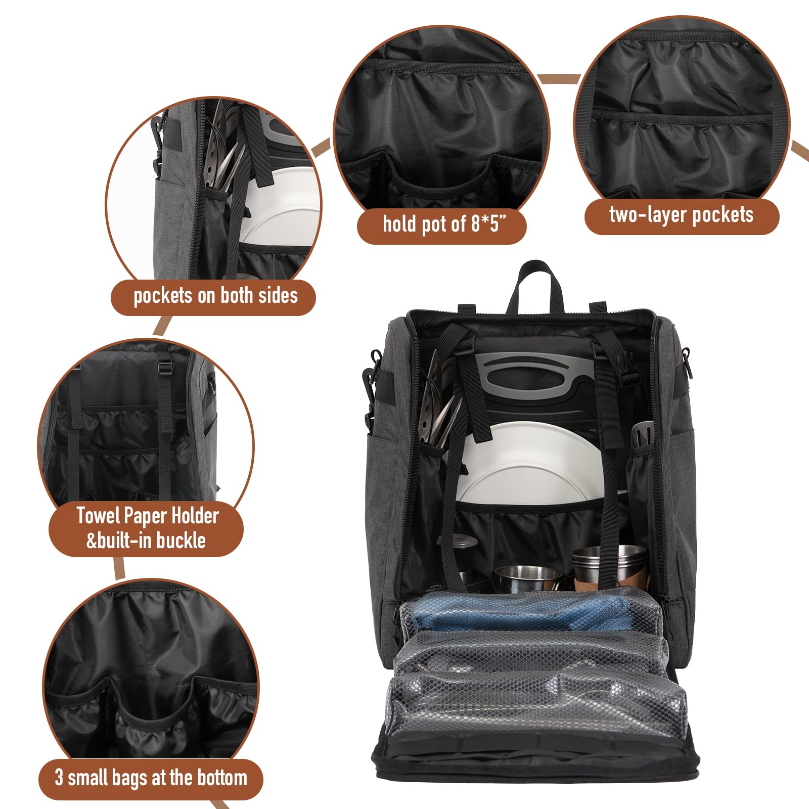 - 2-in-1 Carrying Design: Backpack & Handbag for Ultimate Convenience: Designed for versatility, this camping kitchen organizer easily transforms from a handbag to a backpack with its padded, adjustable shoulder straps and crossbody strap. Carry it comfortably your way—whether by hand or on your back—making it the perfect companion for camping, picnics, and outdoor barbecues. Enjoy effortless portability and hands-free convenience wherever your adventure takes you