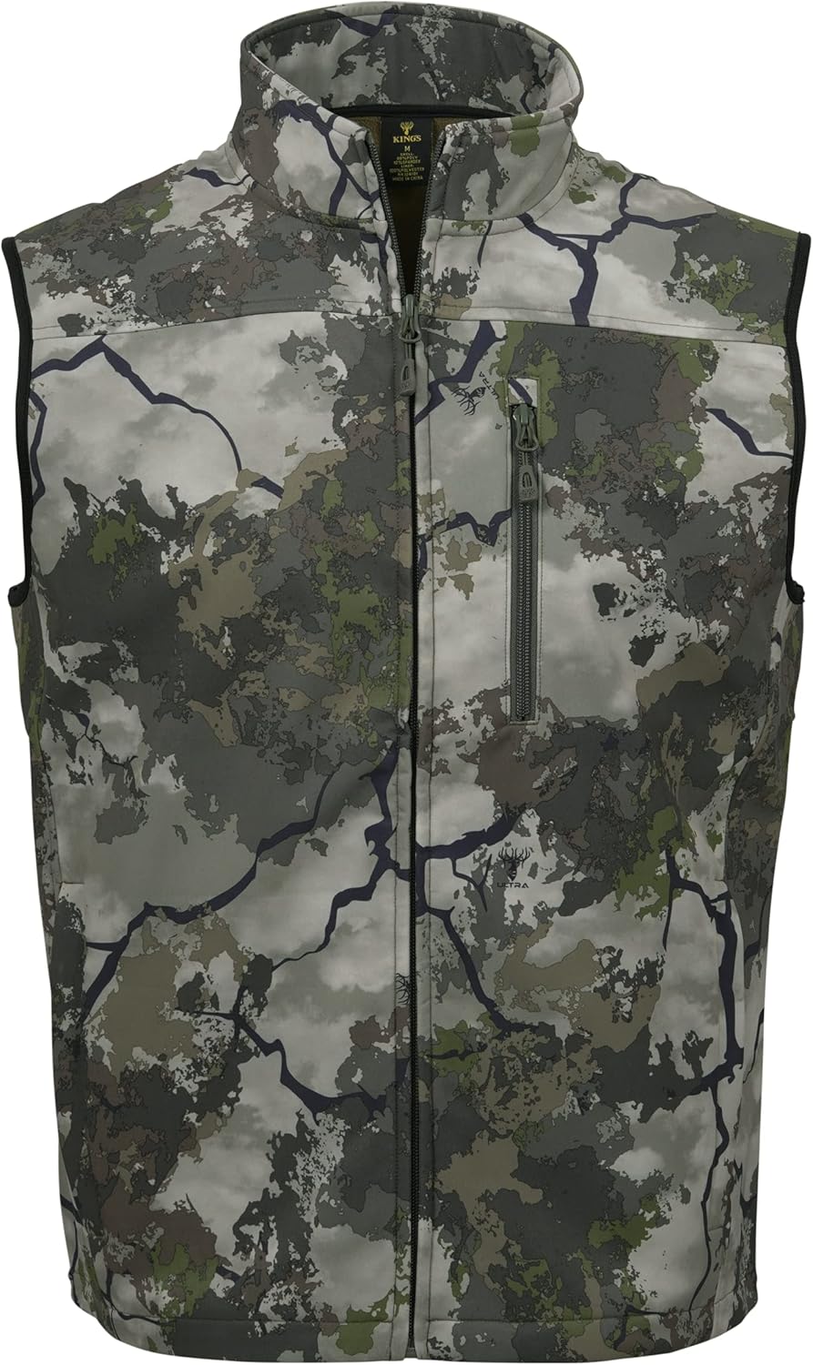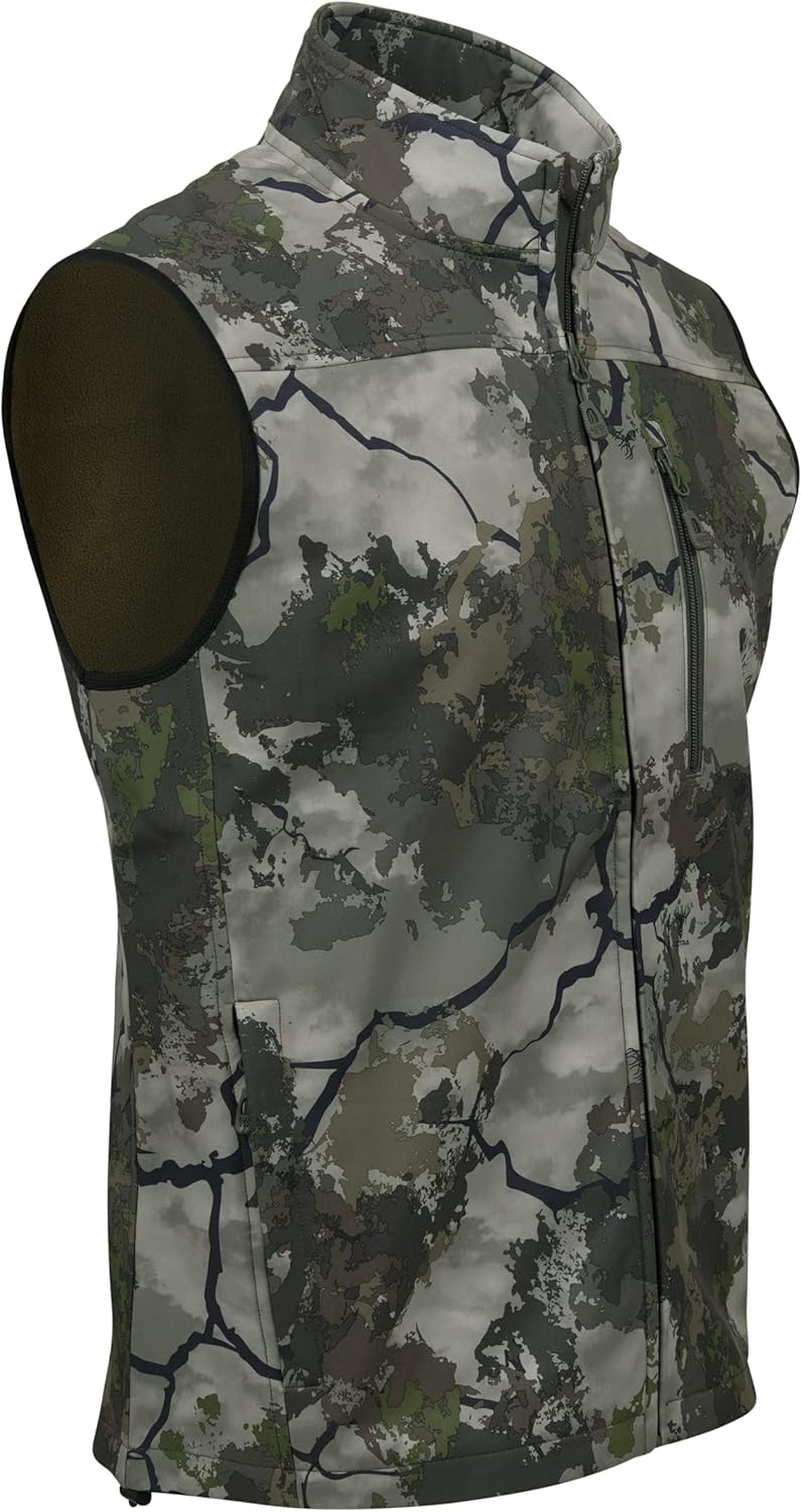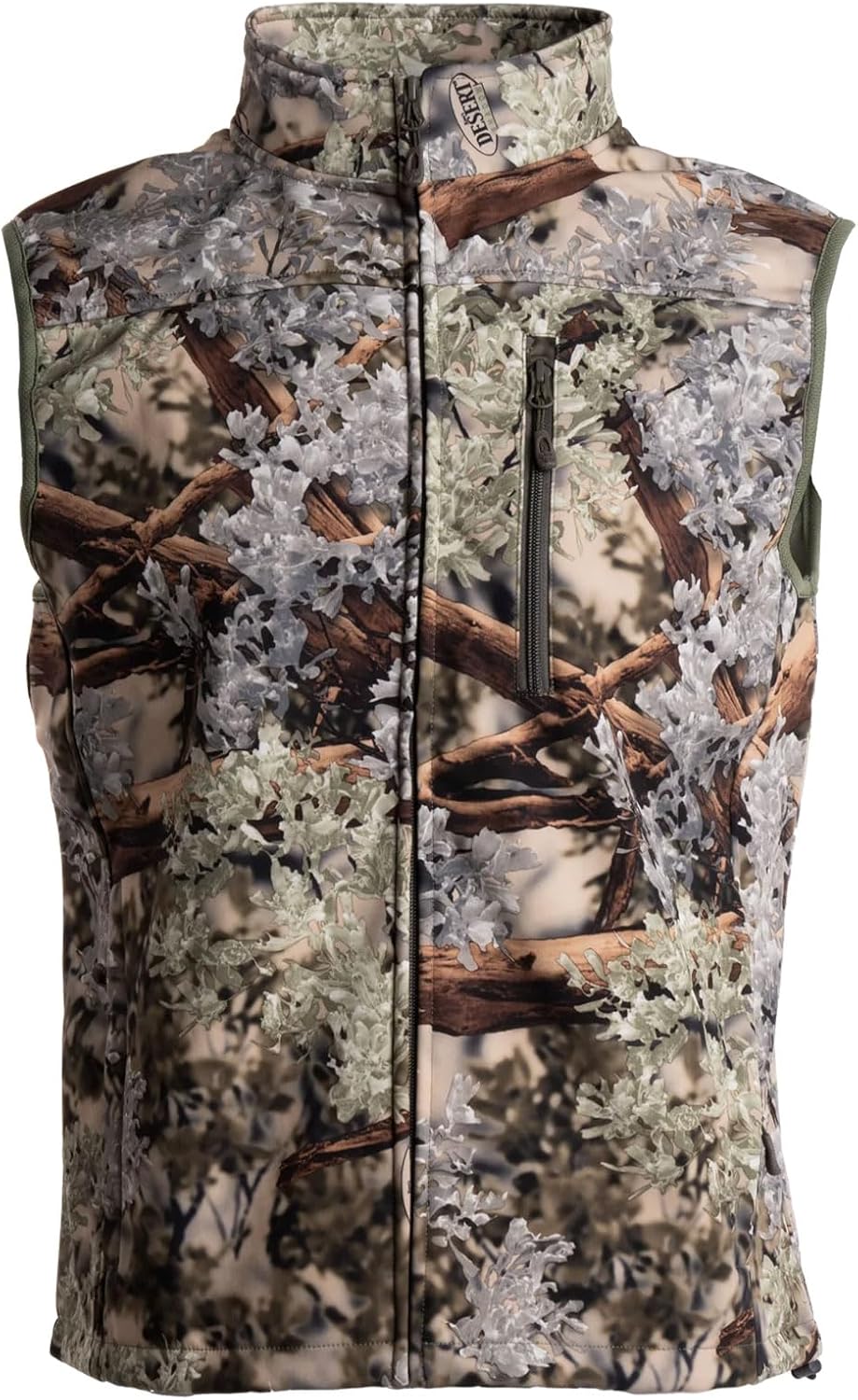 100% polyester material. Quick dry. Two side pockets. Single chest zip pocket. Draw cord waist adjustment. Quite and comfortable. Great camo hunting Vest that can be worn as a layering piece for extra warmth or by itself. Desert Shadow camo finish.