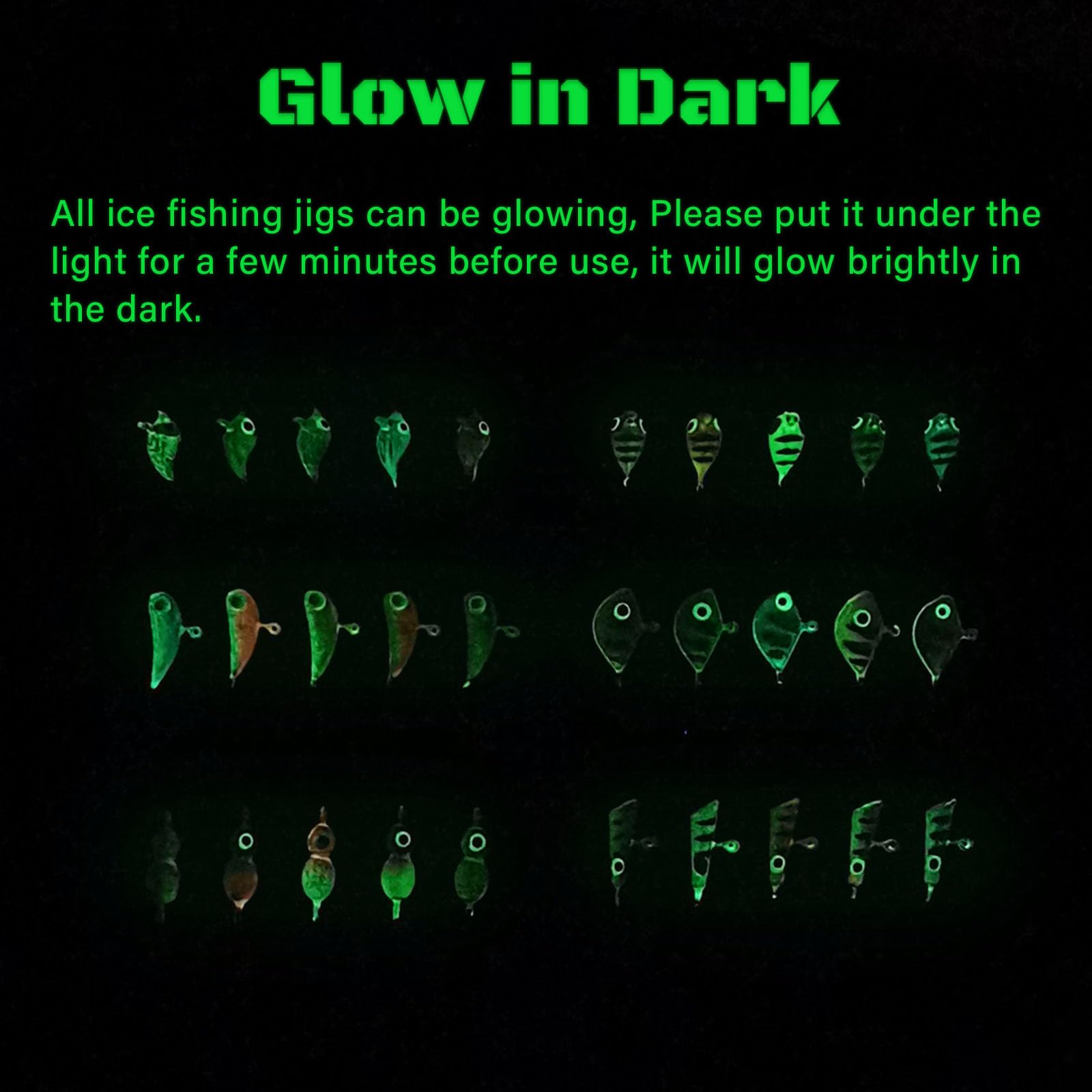 1. All ice fishing jigs can be glowing, Please put it under the light for a few minutes before use, it will glow brightly in the dark. It glows after absorbing light, allowing you to fish at night.