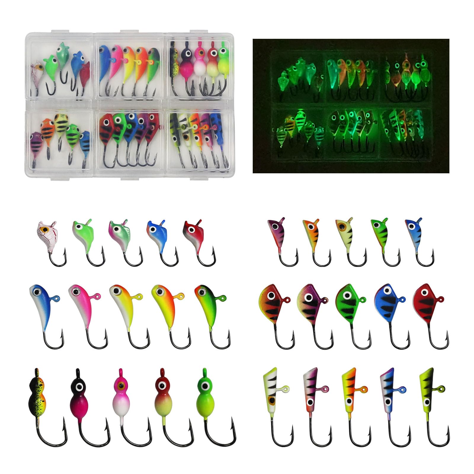KJEIM Ice Fishing Jigs Kit, 30pcs Glow Ice Fishing Lures Luminous Ice Fishing Gear Winter Fishing Jigging for Crappie Pike Panfish Walleye Perch Bluegill