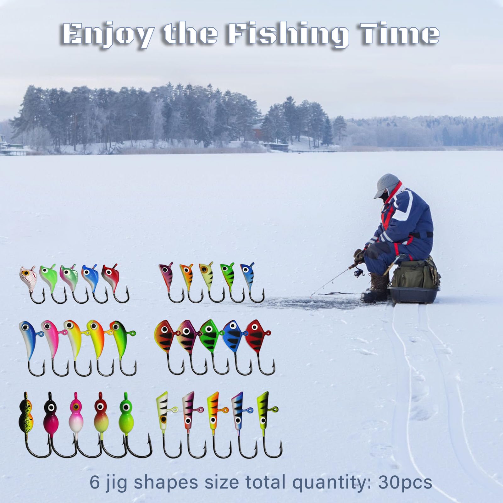 - Efficient Ice Fishing Jigs: The 30pcs ice fishing jigs set cointains 6 different kinds of shapes fishing jigs and different colors for each shape to meet all your needs.