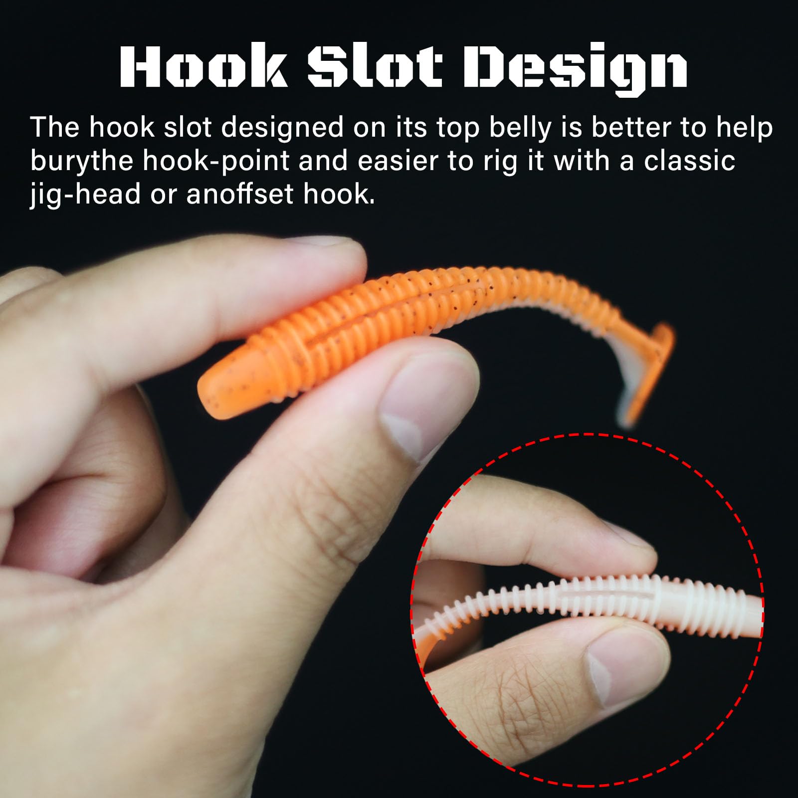 - Hook Slots Design: The hook slot designed on its top belly is better to help burythe hook-point and easier to rig it with a classic jig-head or anoffset hook. Double hook groove design helps to bury hook point and avoid obstacles.