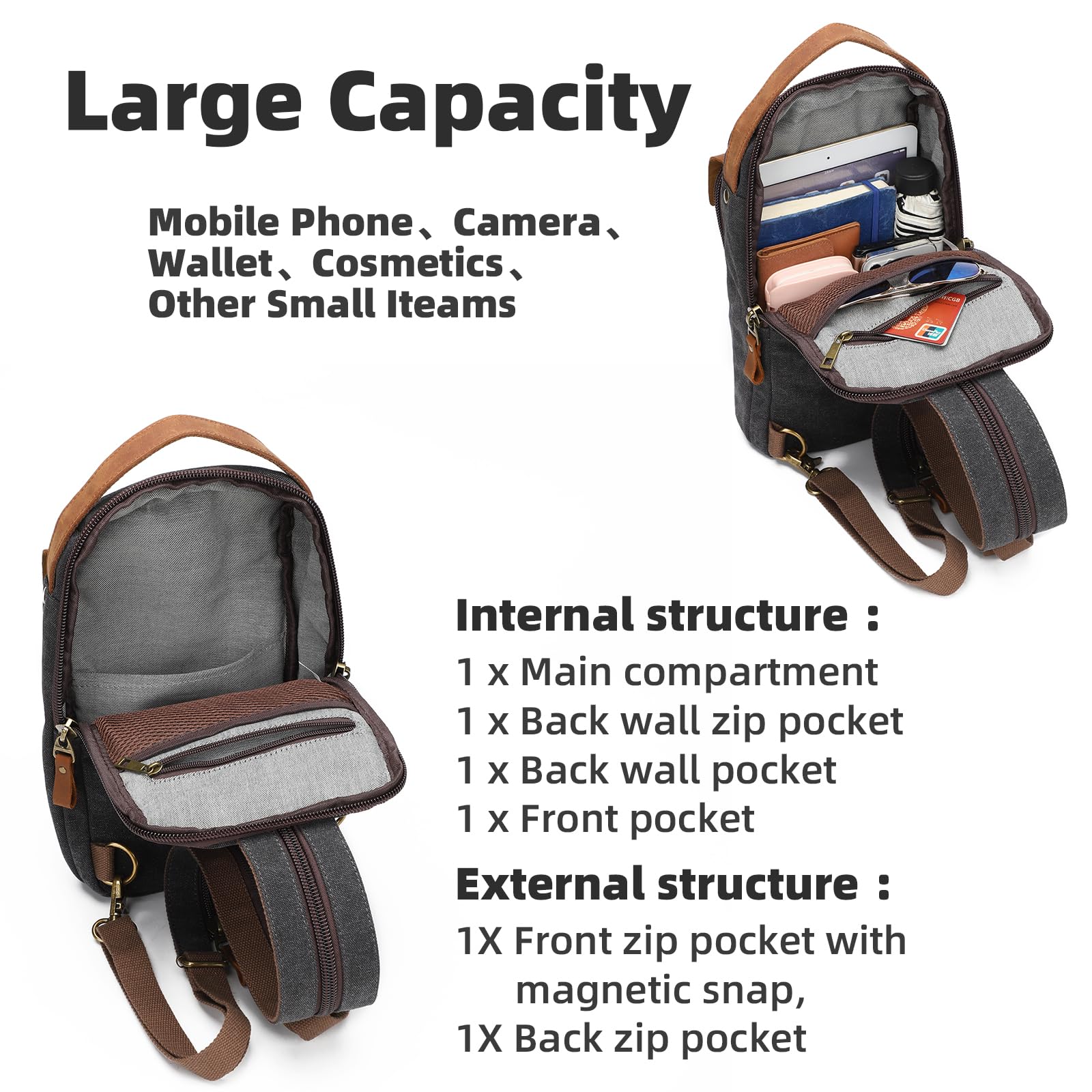- Large Capacity:Interior Details:1xMain compartment ,1xBack wall zip pocket . 1xBack wall pocket. 1xFort pocket.Exterior Details: 1xFront zip pocket with magnetic snap, 1xBack zip pocket.It can easily carry ipad mini, phone, power bank,wallet,umbrella and effectively keep your small items like cards, tissue, keys etc.With its large capacity, the KL928 canvas sling bag can accommodate your daily essentials.