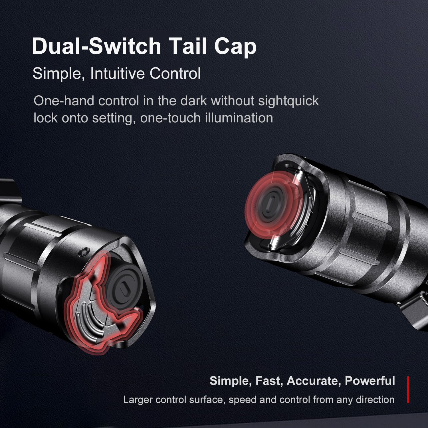 - KLARUS PATENTED TACTICAL SWITCH: One-touch Turbo, One-touch Strobe. Tail dual-switch makes simply one-hand to access the strobe function. Large button contact area even in dark you can easy to turn on the light.