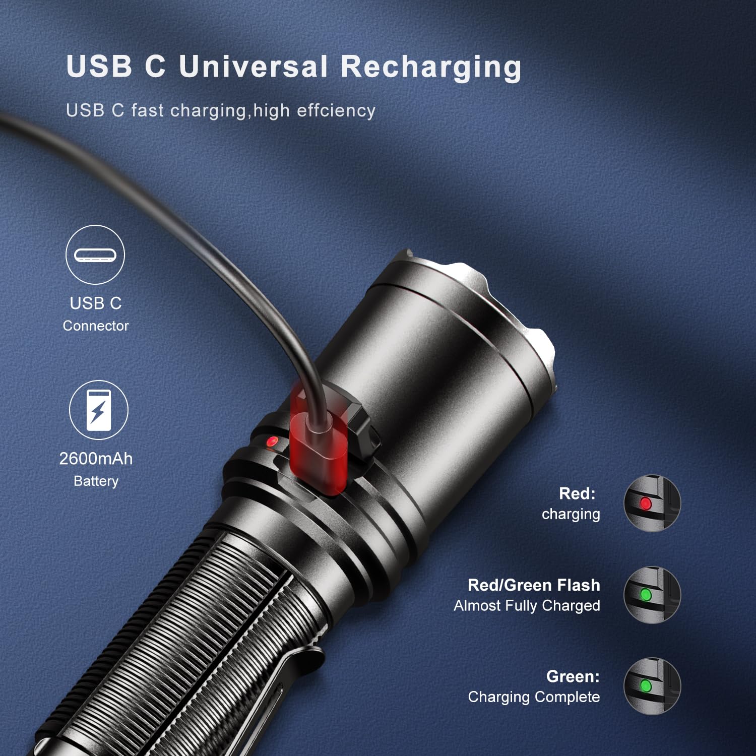 - DIRECT USB C RECHARGE: Charge via the USB-C port on the flashlight, equipped with 1x 2600mAh battery, larger battery capacity than an AA battery, easy & convenient to get and wide compatible.