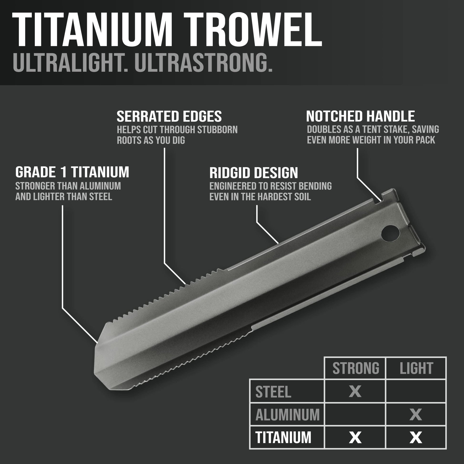 - Trowel: This ultralight trowel weighs only 1.27 oz (36 grams) while delivering superior strength for digging through hard, rocky soil and cutting small roots with its serrated edges. At over 8" in length, it provides excellent grip for tough terrain, and its versatile design includes holes for use as a tent peg alternative. Includes a bright orange carrying case to keep your pack clean after use.