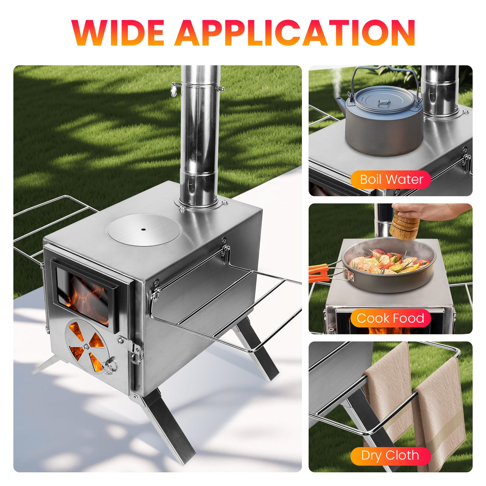 - [Versatile Application]: Suggestion: Please read the installation instructions, it is best to burn once before using a wood stove. During winter camping, backpacking, ice fishing, and hunting trips, you no longer need to endure the cold nights in the tent. Meet the needs of avid outdoor enthusiasts for adventure, car travel, and shelters.