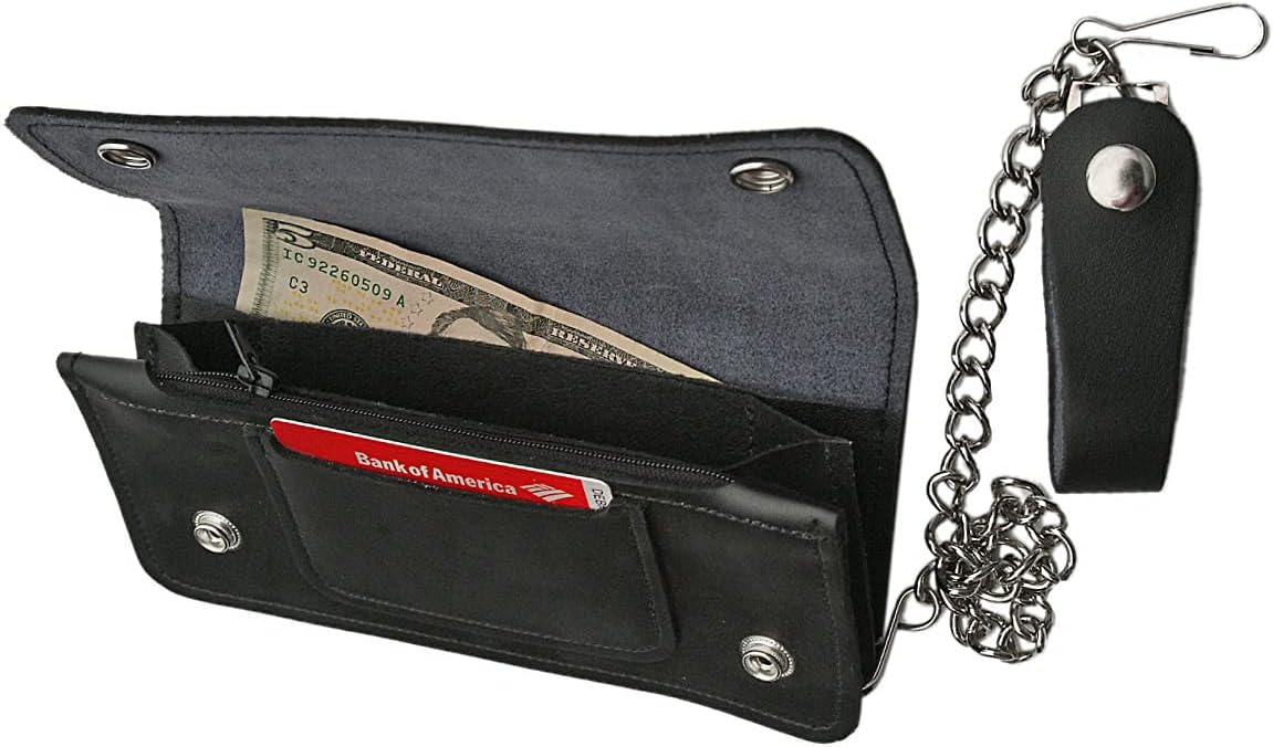 This Large Bi-Fold Biker Wallet by Szco Supplies is 8 Inch in length and 3.75 Inch wide. The wallet is made of black leather with an inner zippered pocket It comes with a 12 inch chain which attaches to a leather snap belt loop.