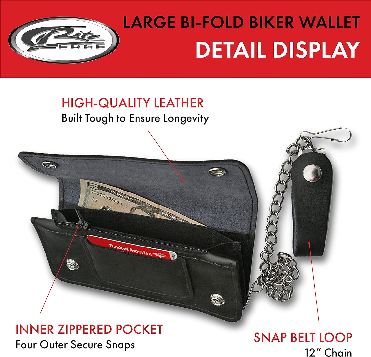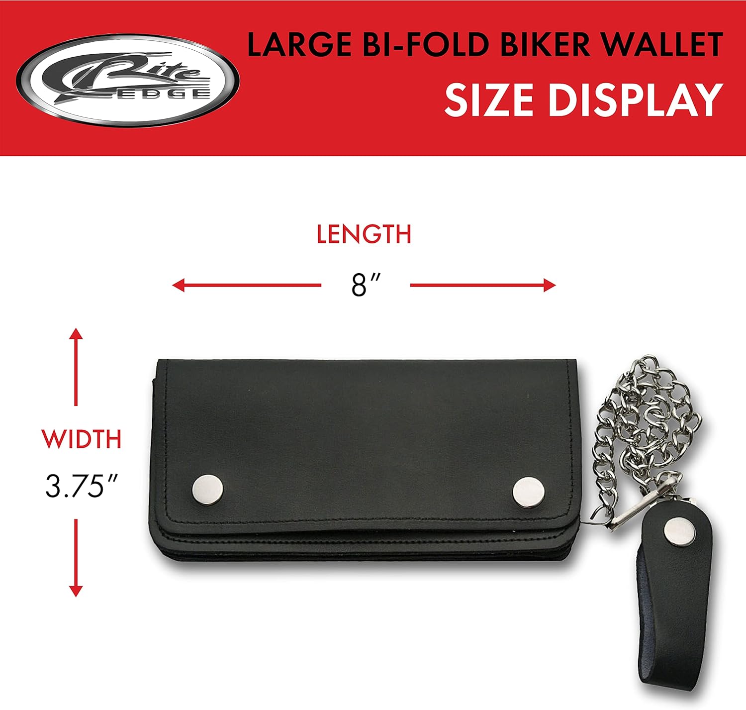 Large Black Bi-Fold Biker Wallet - 8x3.75 Inch, Durable Leather Design