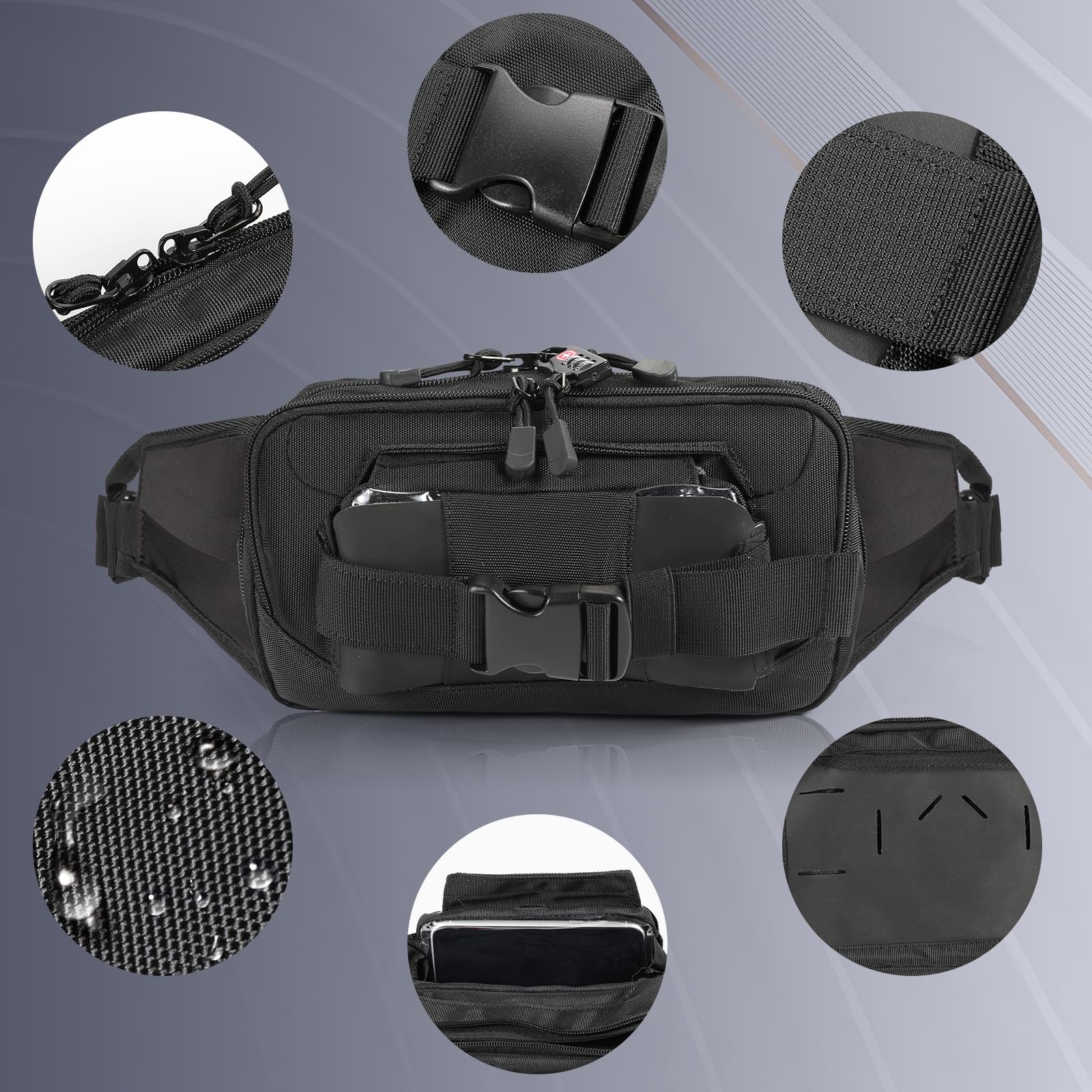 - 【SPECIAL FUNCTION】: The external cellphone pocket with a touch screen window for photo or video surveillance and The adjustable cell phone compartment doubles can be as a NAV board,. Tactical Fanny Pack is ideal to conceal your everyday compact carry while maintaining a low profile; Lockable zipper pulls a paracord tab and add security.