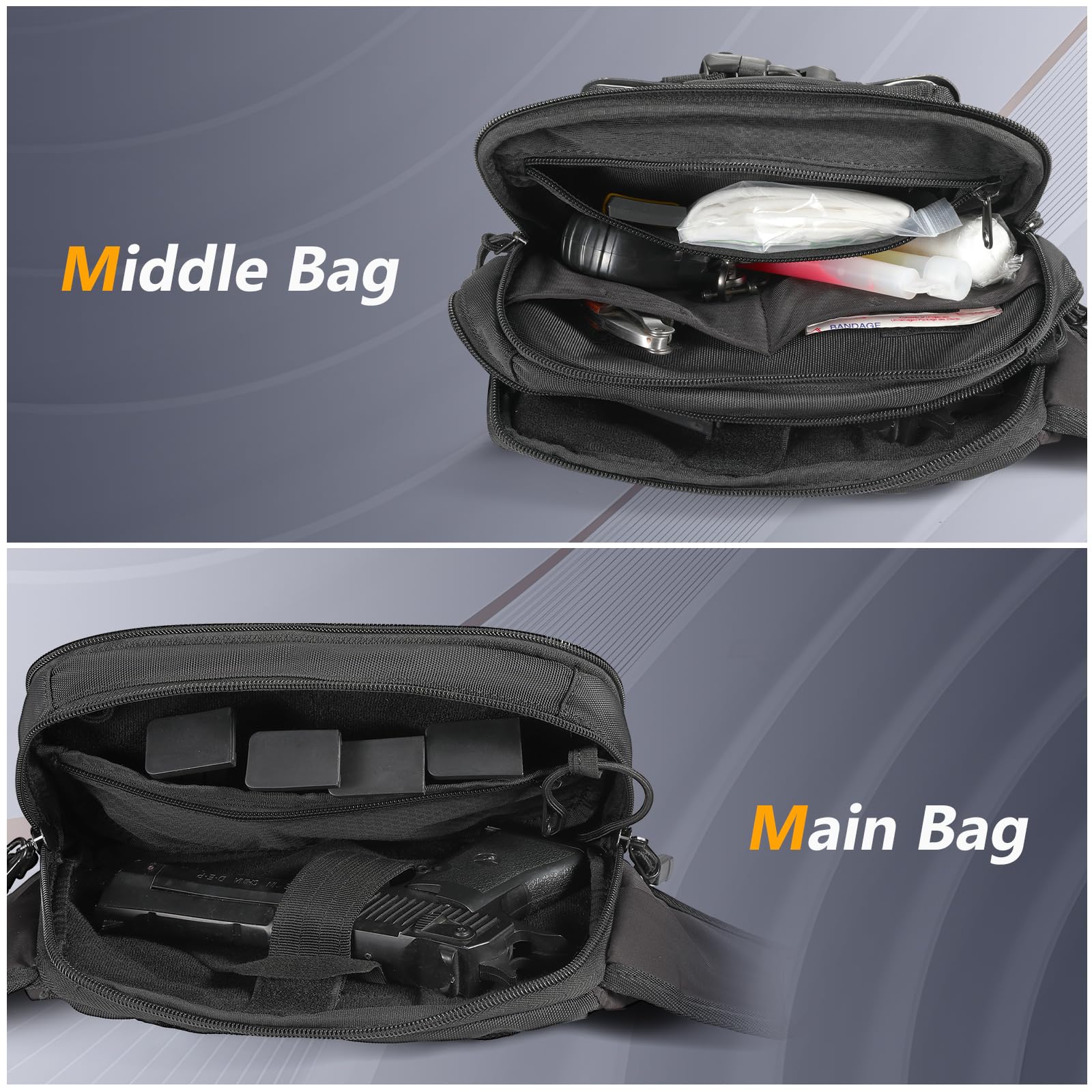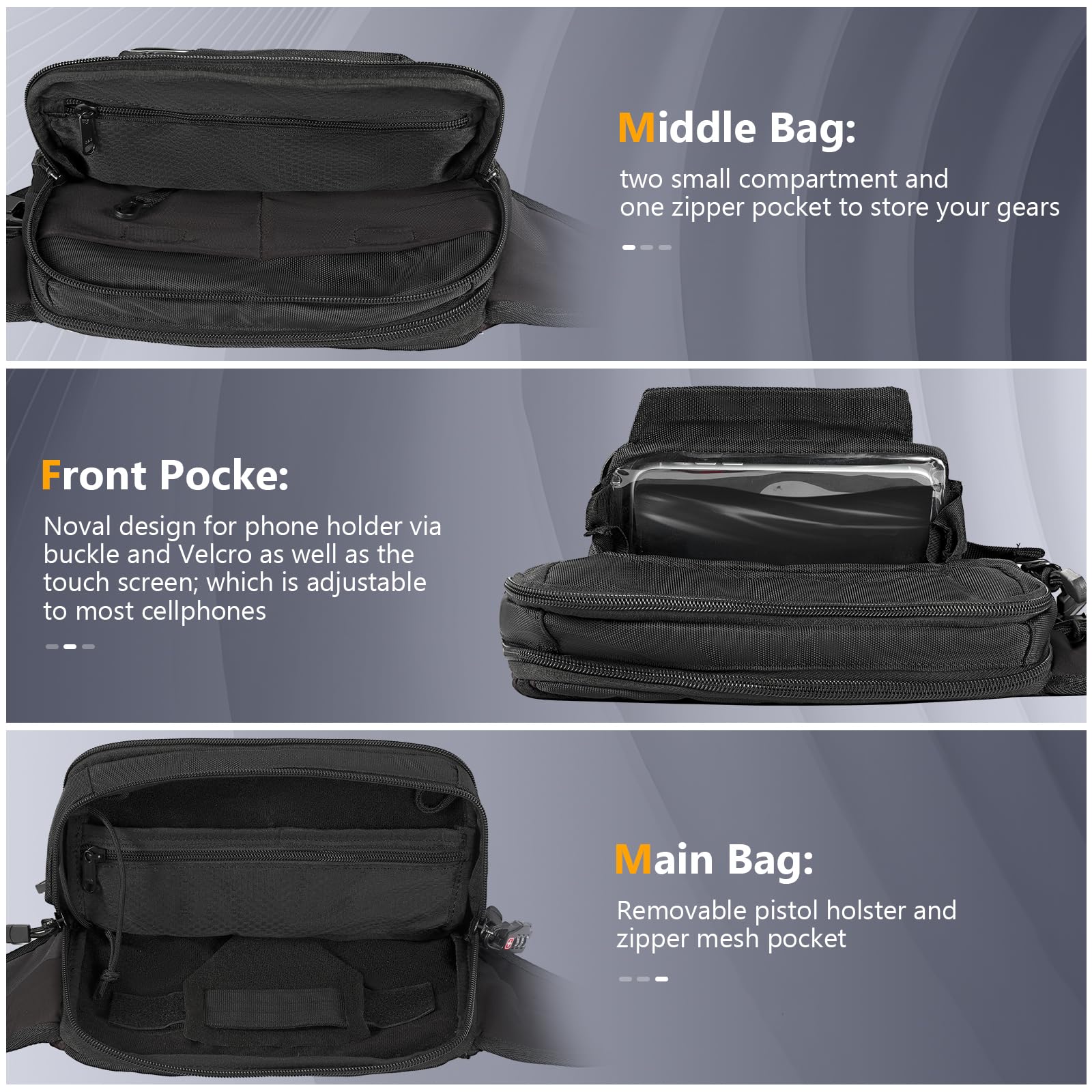 - 【VERSATILE&MULTI WEAR STYLE】: the tactical chest bag can be as a tactical hip bag, tactical belt bag, or tactical crossbody bag, or sling bag, waist bag; Switching from normal sling carry to attachment on a pack strap with back MOLLE system clips, this tactical pack is ready for whatever you have; With removable holster, you can use the tactical fany bag as a normal universal bag.