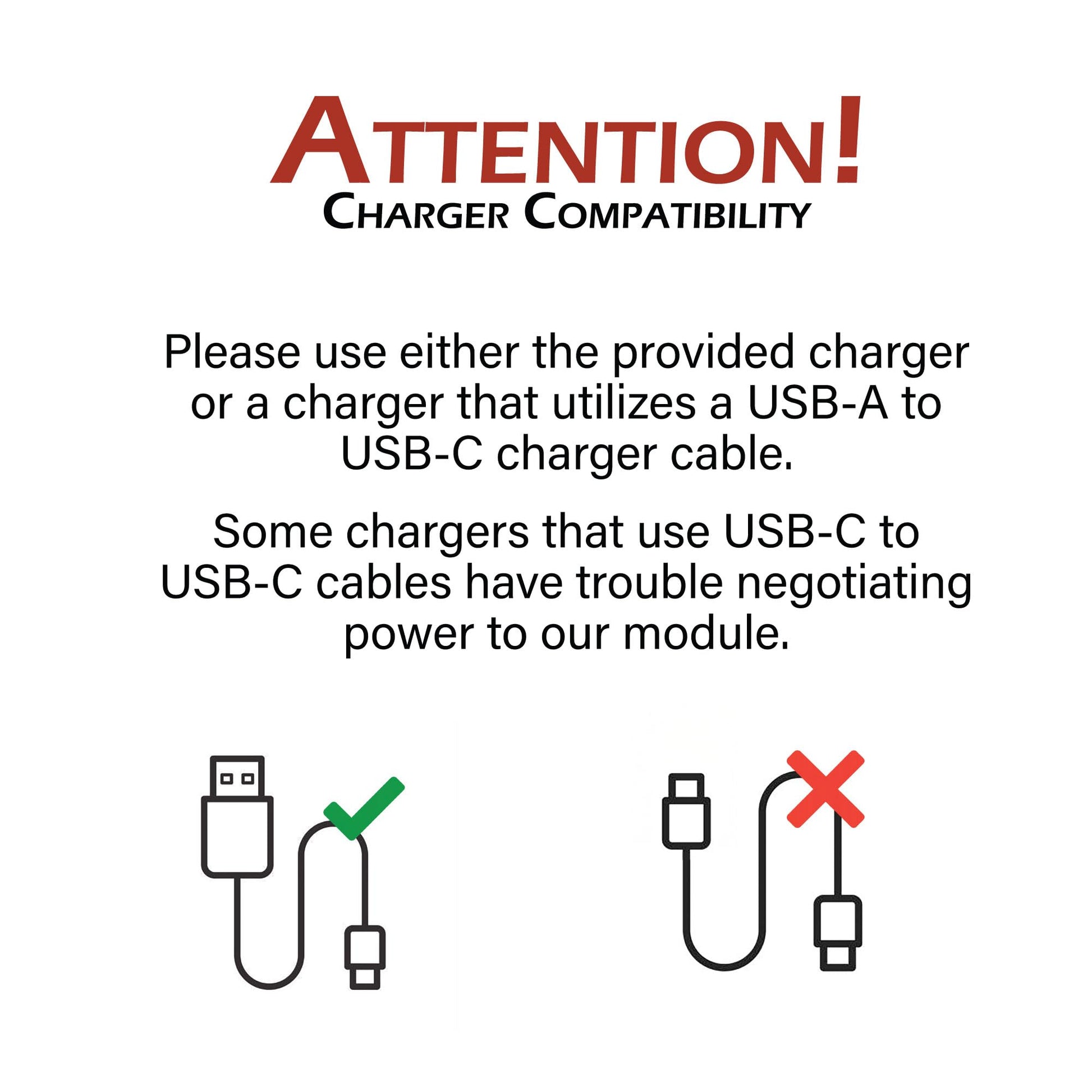 - Rechargeable via USB-C - Cable and Charger provided. The charging module only works with Chargers that use USB-A-to USB-C cables. USB-C to USB-C charger cables will not initiate a charge. Please use the provided charger or another charger that uses a USB-A to USB-C cable.