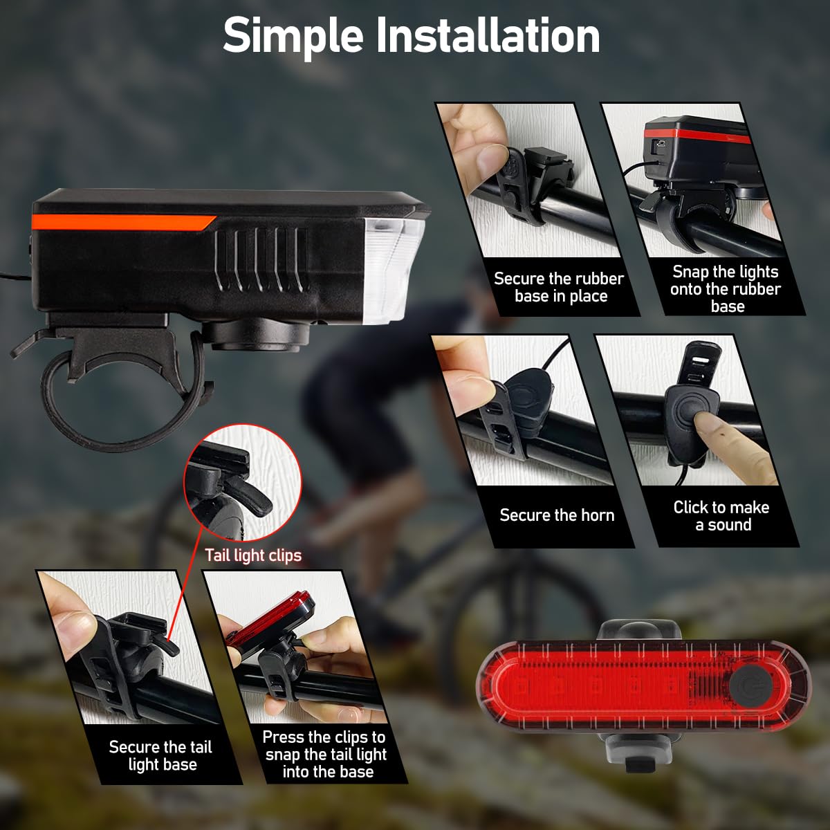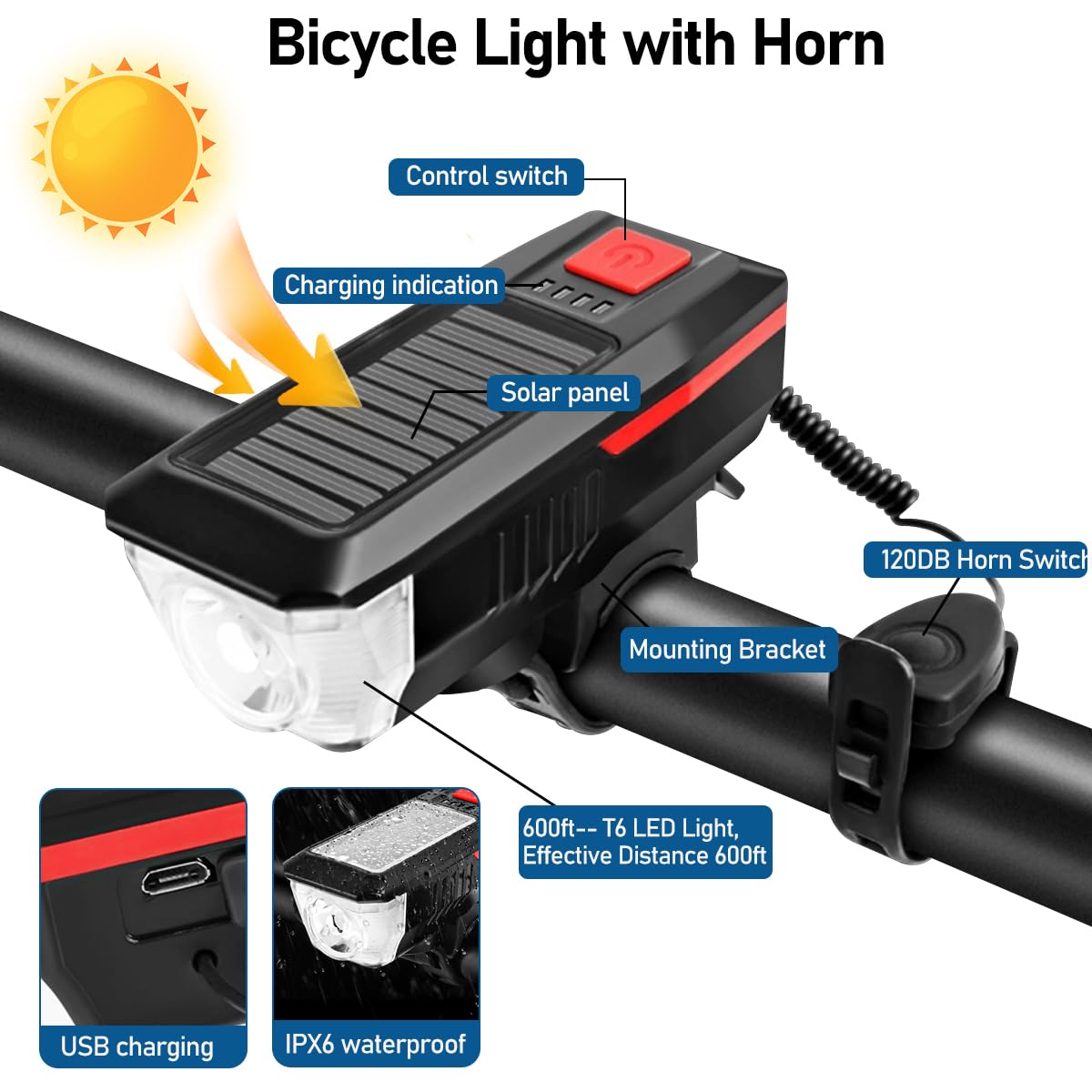 - 【Multiple Light Modes & High Decibel Horn】Solar bike headlight has three different modes, including high brightness, low brightness and flashing mode, and the bike tail light has 4 flashing modes. The horn can reach a powerful sound of 120 decibels, thus minimizing accidents.