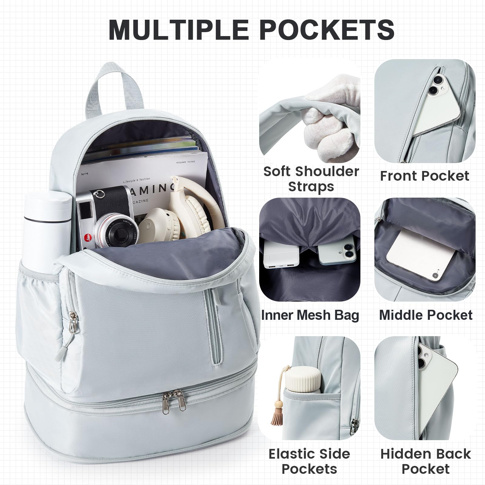 - Multi-functional】The fitness backpack consists of 5 separate pockets of different sizes and large compartments. Multi-pocket backpack is convenient for you to put different items, two side pockets can store water bottles and umbrellas.