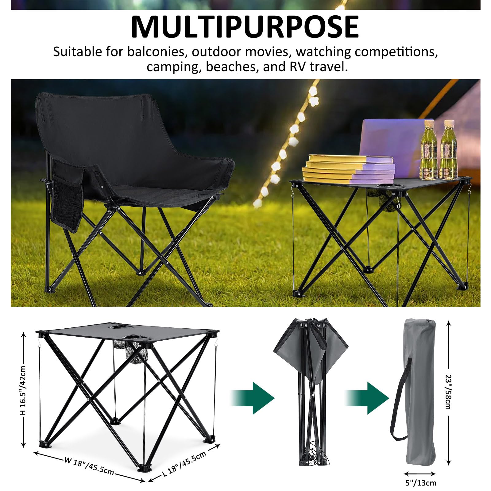 - Meet the Needs of Hobbyists, you will receive 2 x black outdoor folding chairs and a folding camping table, all comes with storage bags for easy carrying and saving storage space, perfect for BBQ, camping, RV travel, lakeside vacation, beach