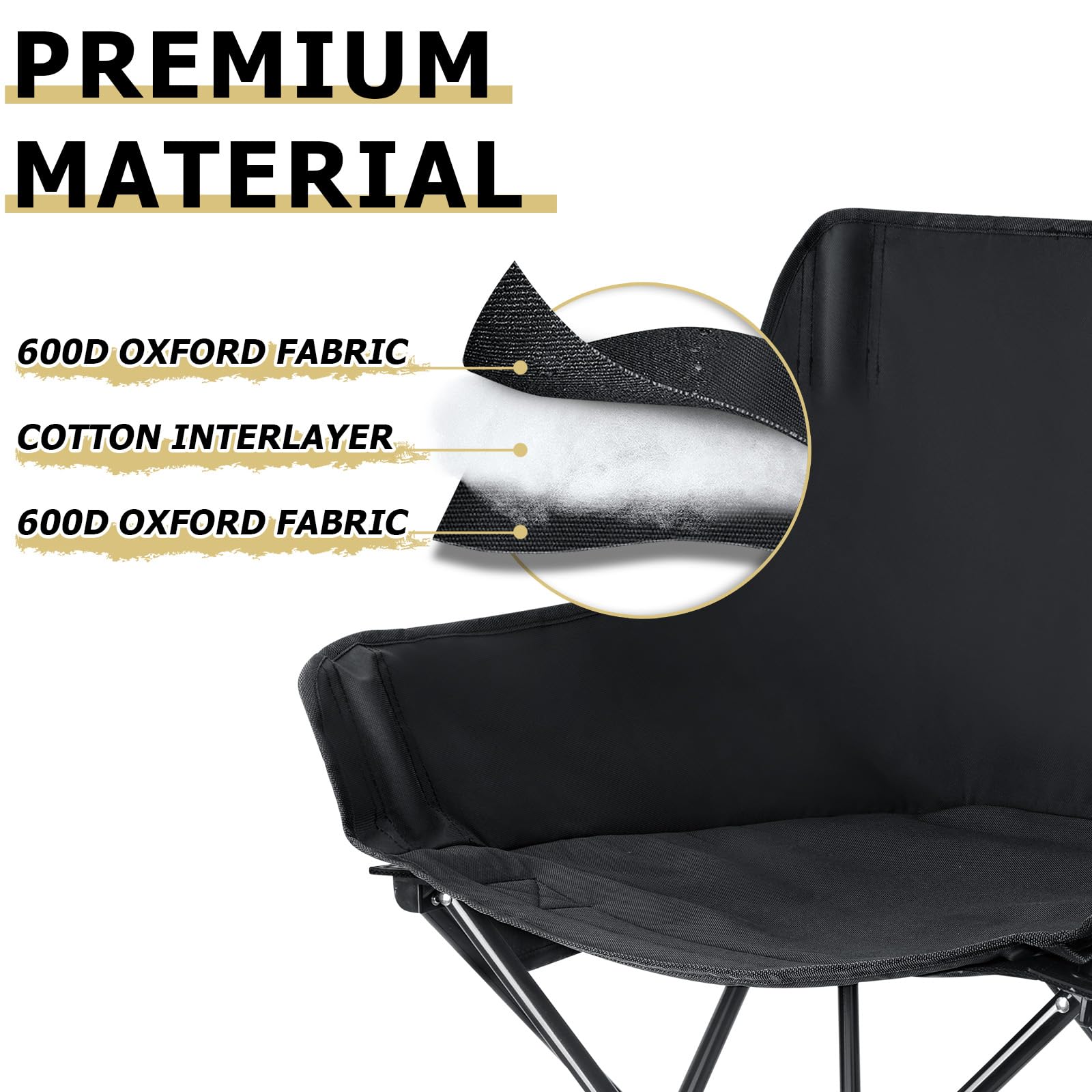 - Supreme Comfort Indulgence, camping chairs crafted with high-strength double layered 600D oxford fabric with pearl cotton, this moon chairs are designed with strength and comfort in mind for you, its moon-shaped deep ergonomically seat ensures unparalleled comfort and relaxation