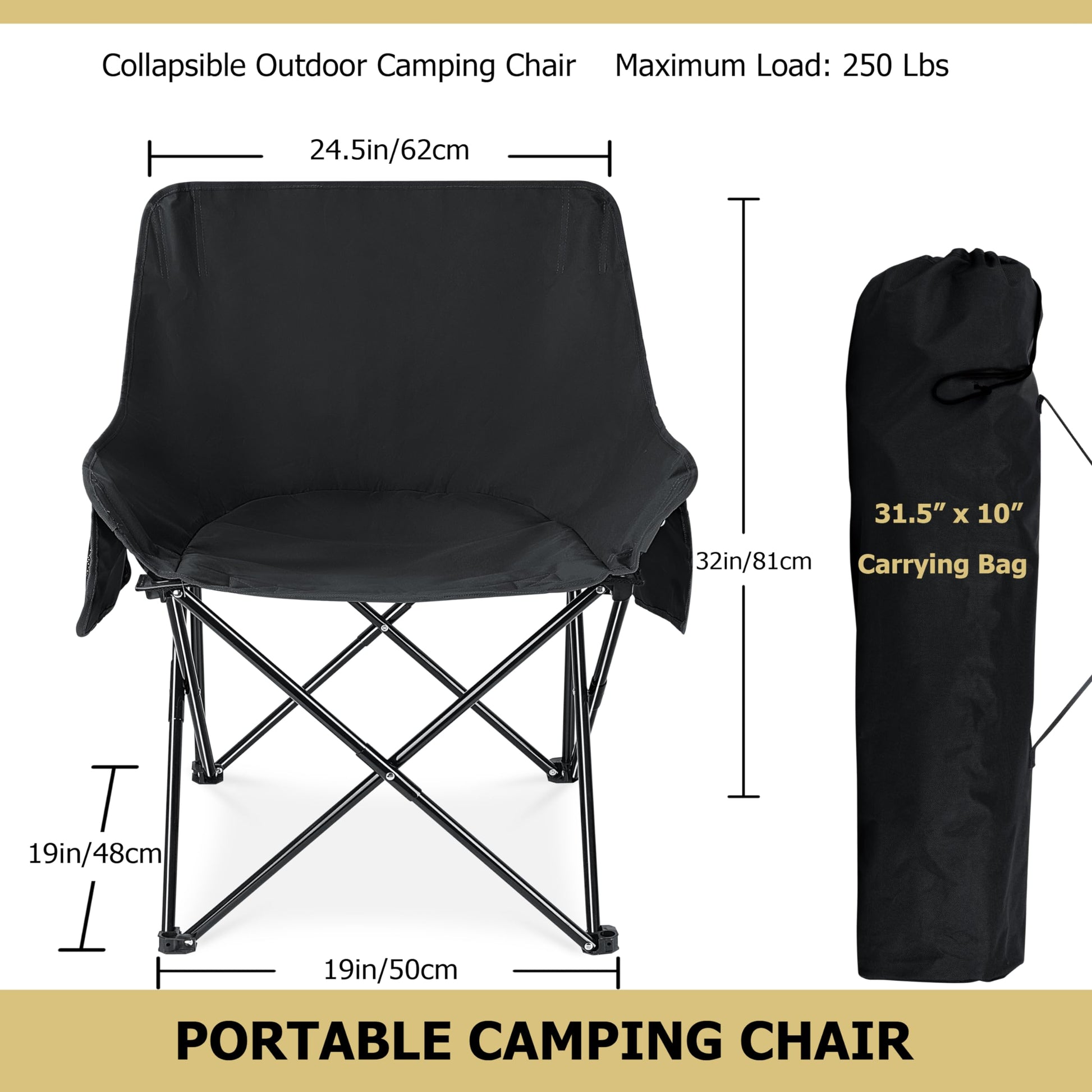 - Convenience and Spaciousness, Unfold our portable camping chairs, measuring 24.5" (L) x 19" (W) x 32" (H), and also widen the seat for enough comfort for even the largest of sizes, the convenient Side Pocket keeps your phone and beverage close at hand, experience comfort and convenience in one package