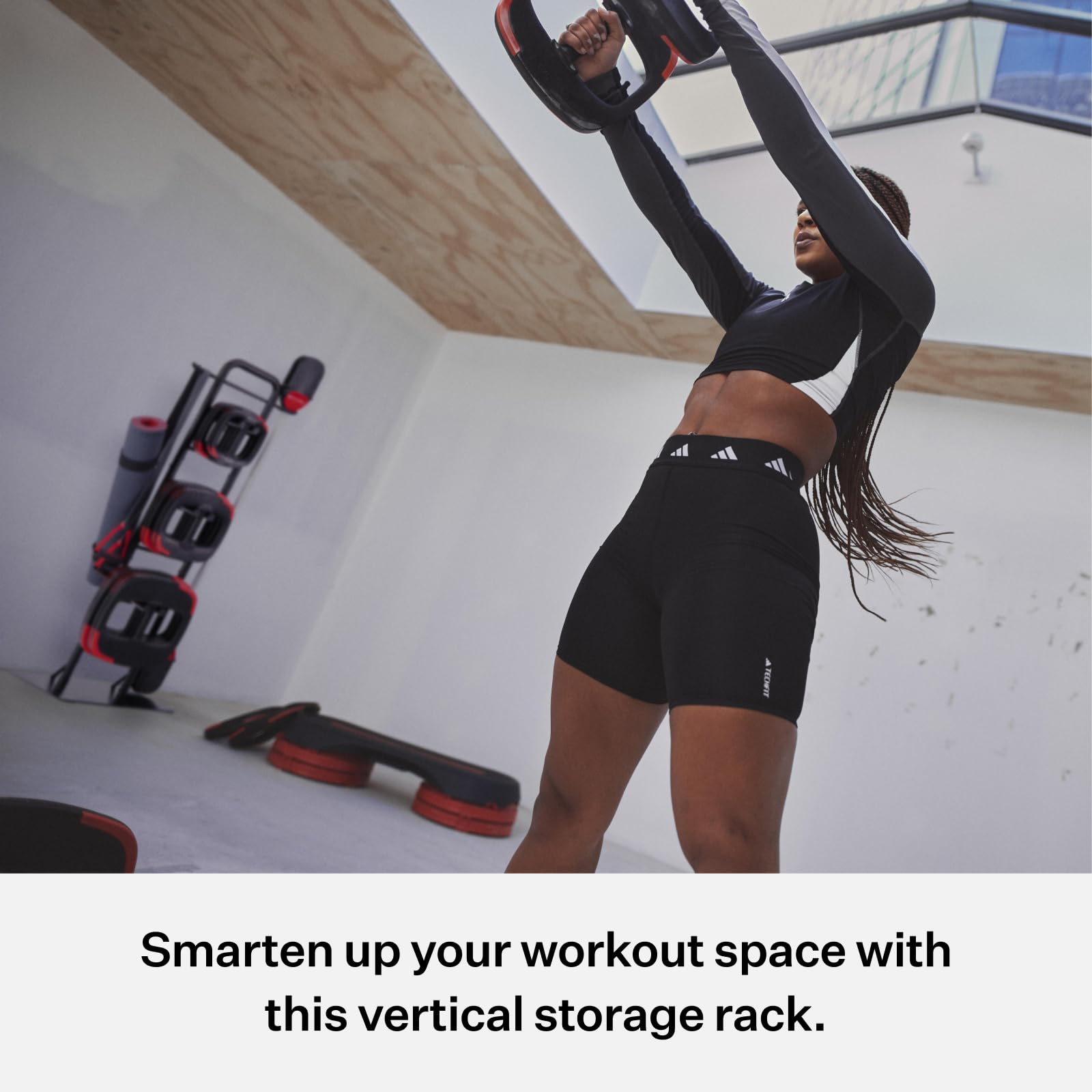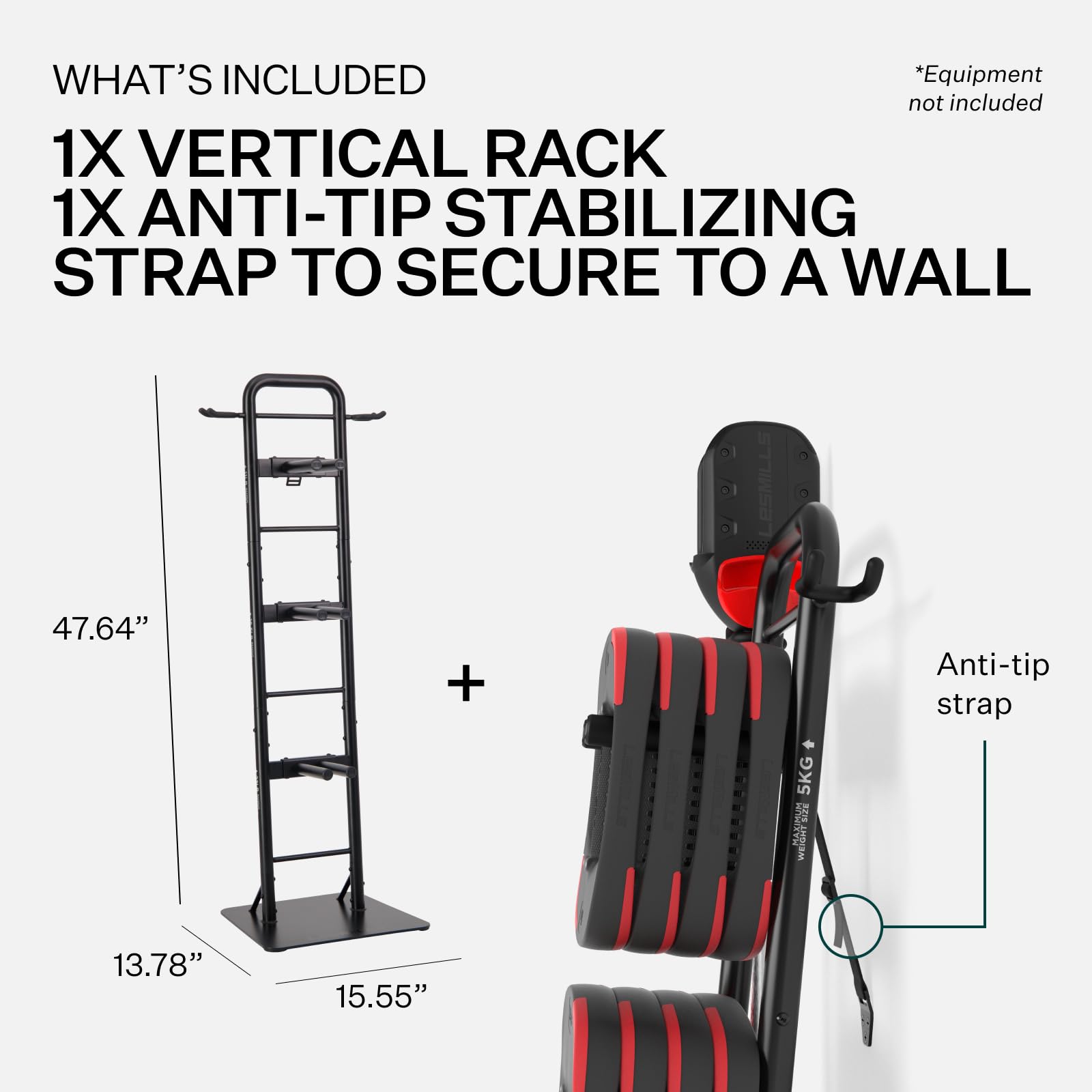 - Smarten up your workout space with this vertical storage rack. * For safety reasons, the anti-tip stabilizing strap must be secured to a wall.