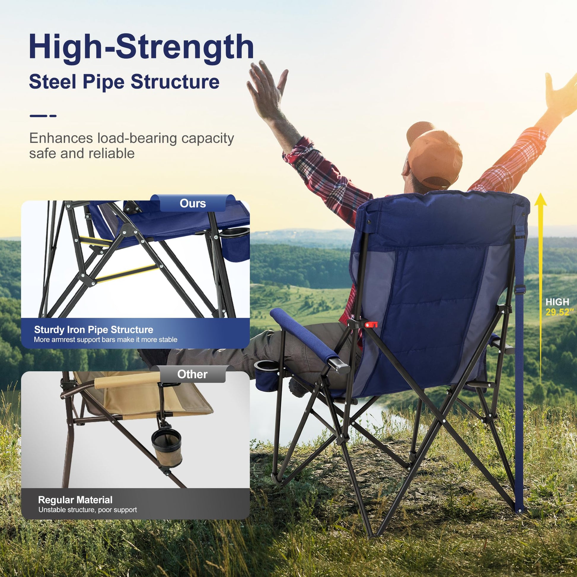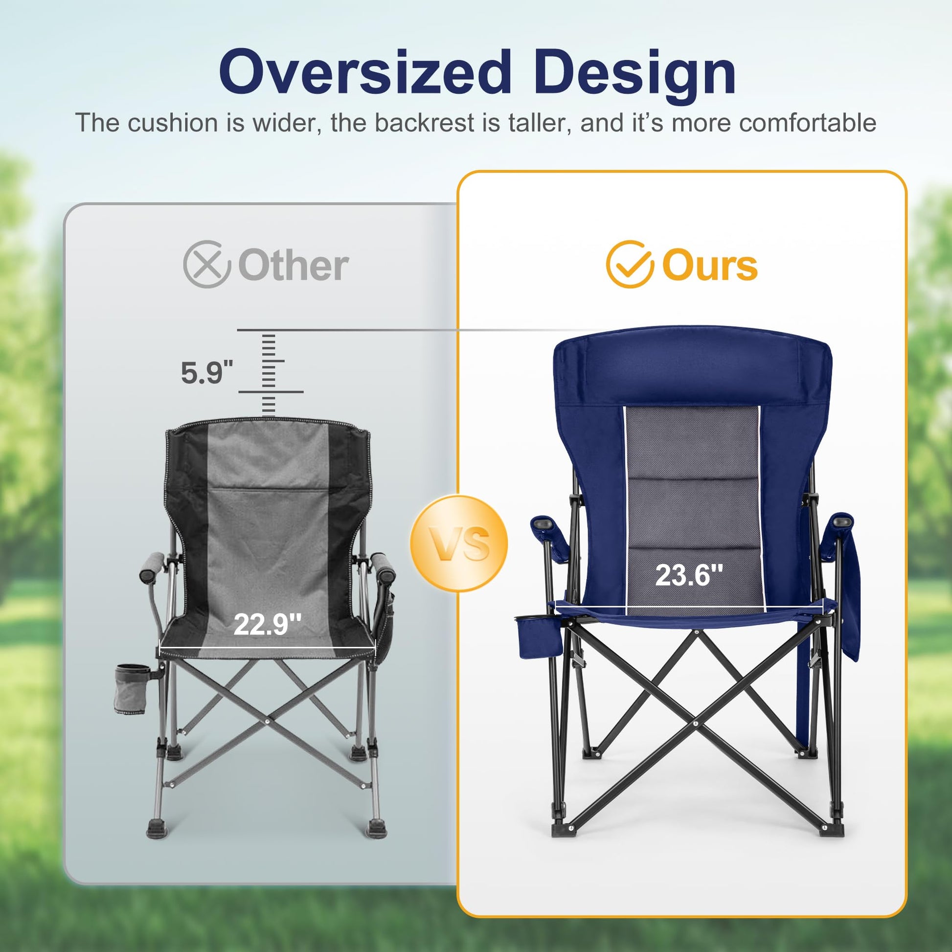- Bigger & Wider Design: Our newly upgraded camping chair is larger and wider than most on the market. With dimensions of 42.91*27.9*26.57in, it's perfect for bigger folks and can support up to 500 lbs.