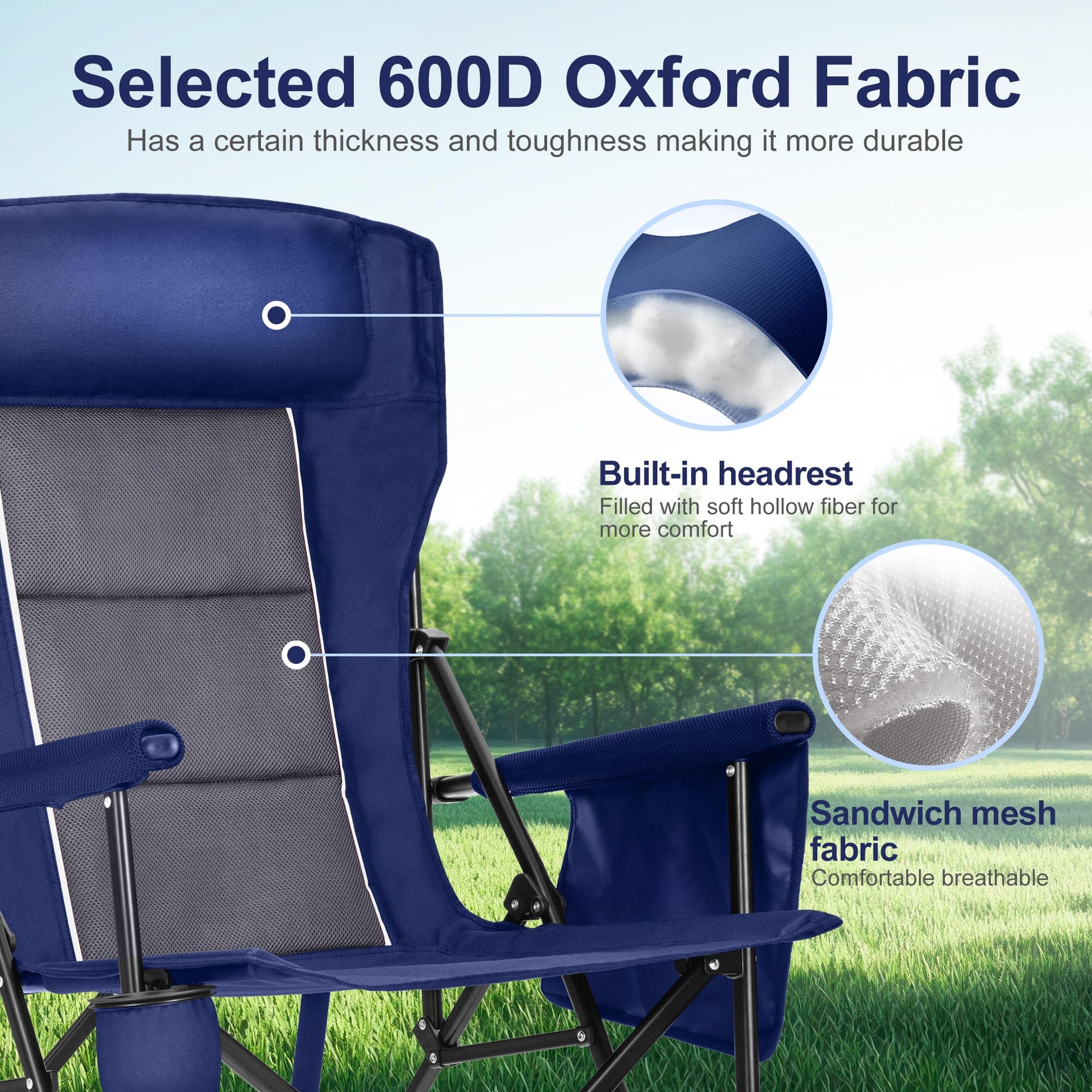 LET'S CAMP Oversized Camping Chairs 29.52" High Back Heavy Duty Lawn Chair Support 500LBS, Portable Collapsible Chair with Cup Holder, Side Pocket(Blue)