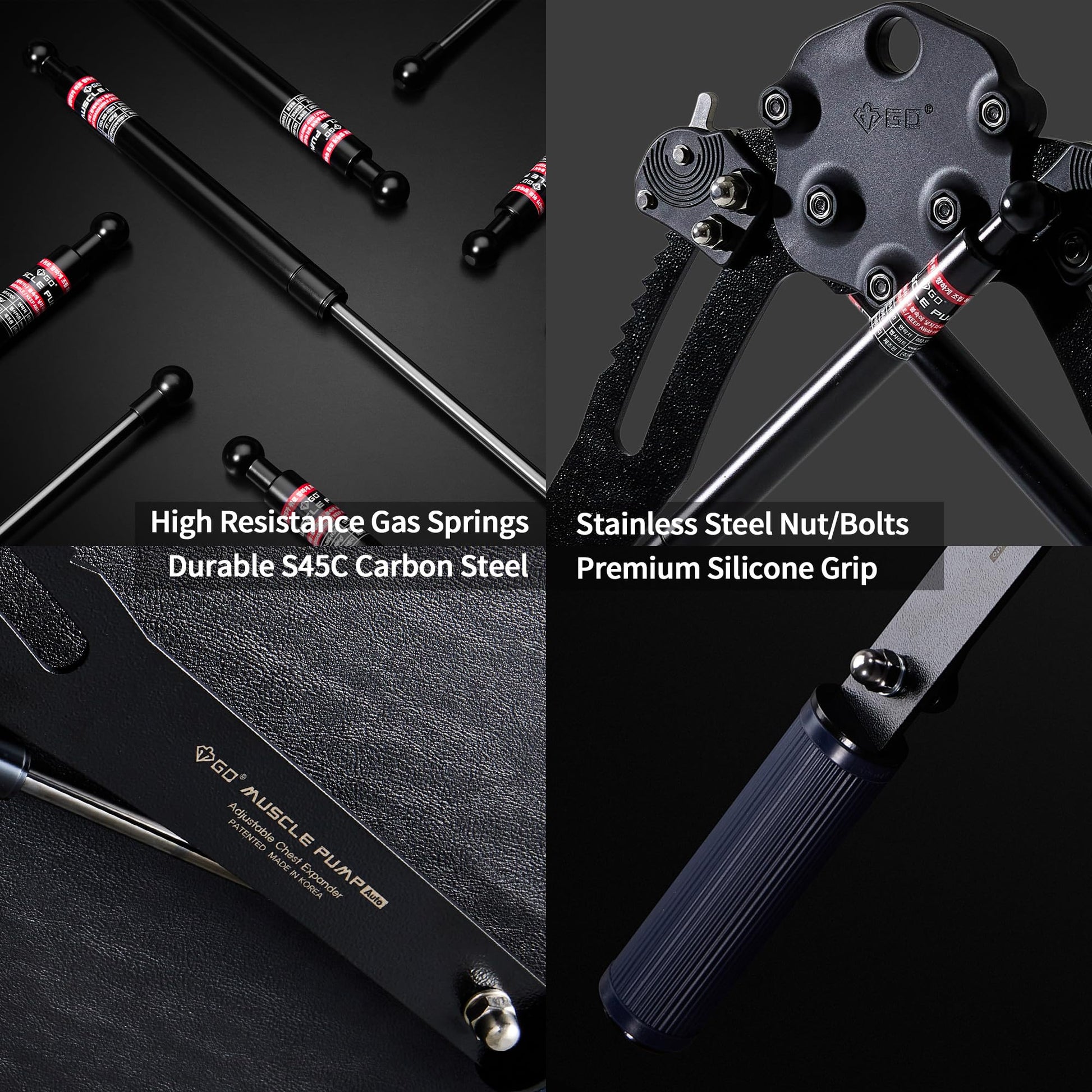 - [Smooth Contraction and Compression Resistance] GD MUSCLE PUMP features a unique gas spring technology in its chest expander. Unlike traditional coil springs, the gas spring provides a smooth and gradual increase in resistance, minimizing the risk of sudden tension release. You can feel consistent resistance throughout the entire range of motion, ensuring a safe and effective workout experience.