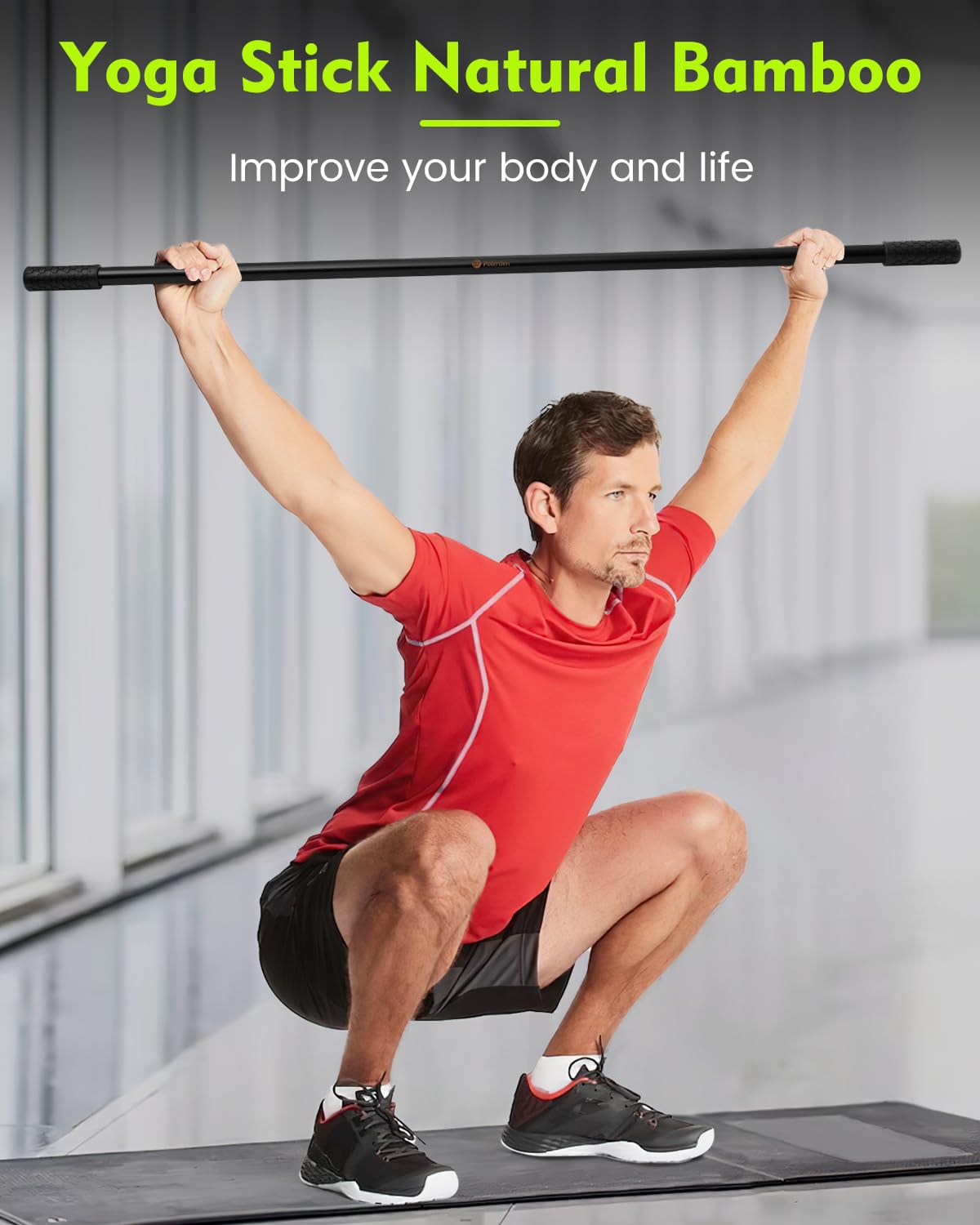 P Polerden Yoga Stick Natural Bamboo 5ft, Stretching Stick for Mobility, Exercise Stick with Non-Slip Ends, Exercise Dowel for Physical Therapy, Balance Pole and Stretch Bar for Stretching Equipment Black