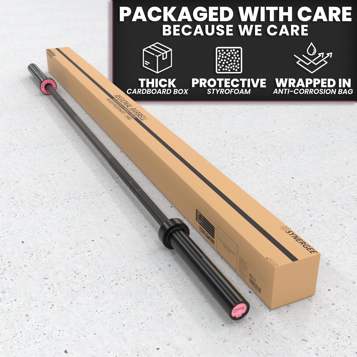 - ★ WHAT’S IN THE PACKAGE ★ - The 15KG Regional Barbell features a black phosphate-coated shaft and sleeves. With a 28mm diameter. To enhance its appearance, each bar is hand-finished with a stainless steel pink ring, adding a sleek and stylish touch.