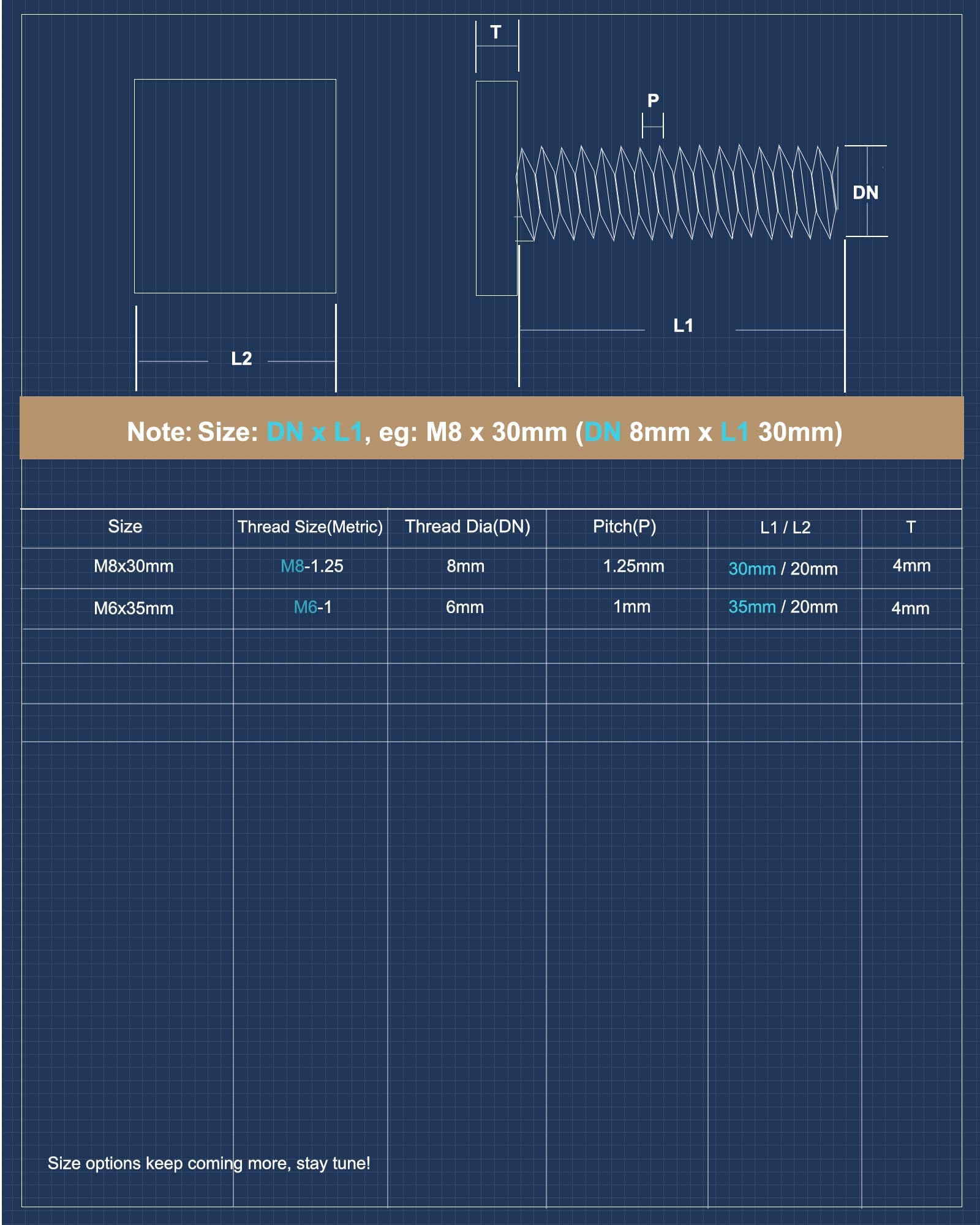 - Technical Specification - the t bolt is made of 304 solid stainless steel, 79 in x 0.79 in x 0.16 in (20mm x 20mm x 4mm) square head base, m6 / m8 threading, 30mm / 35mm / 65mm length