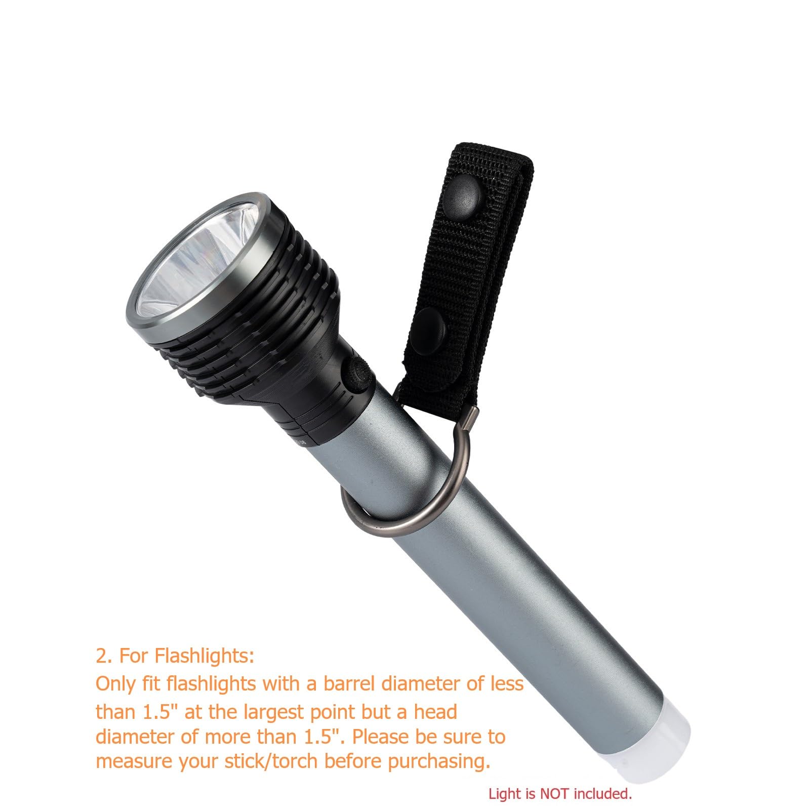 - COMPATIBILITY - Inside diameter of rugged metal ring: 1.5". 1. For sticks: only fit 1 1/4" diameter PR-24 style side-handle batons/T-batons, and collapsible batons with a diameter greater than 1.5" for top handles. 2. For Flashlights: only fit flashlights with a barrel diameter of less than 1.5" at the largest point but a head diameter of more than 1.5". Please be sure to measure your stick/torch before purchasing.